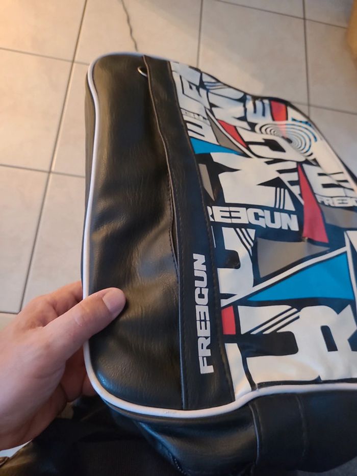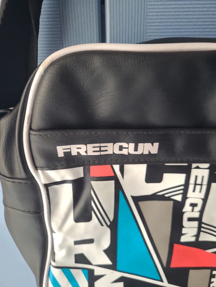 Sac bandoulière Freegun. 40cm par 30cm. Couleur noir avec motif. Similicuir. Poche avant. Un léger accroc sur le motif voir photo 4.