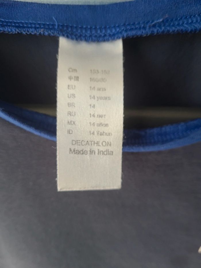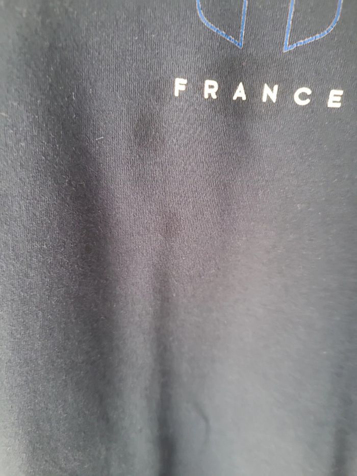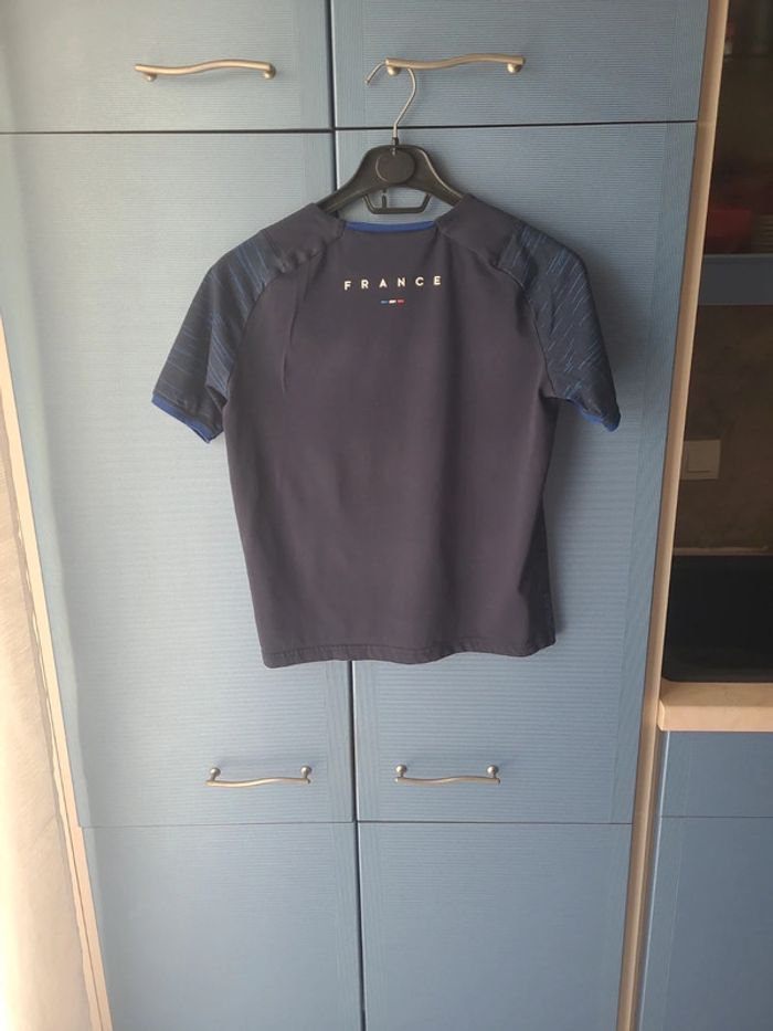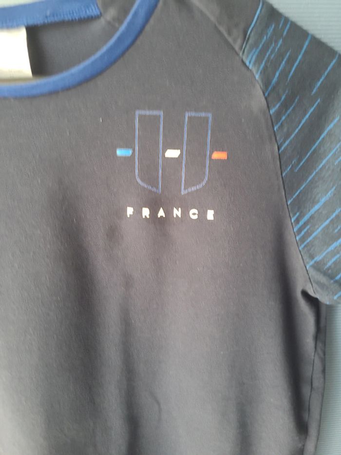 Tee-shirt Équipe de France, marque décathlon. Taille 14 ans, manches courtes. Couleur bleu marine. Quelques petites tâches au niveau du marquage France voir photo 3.