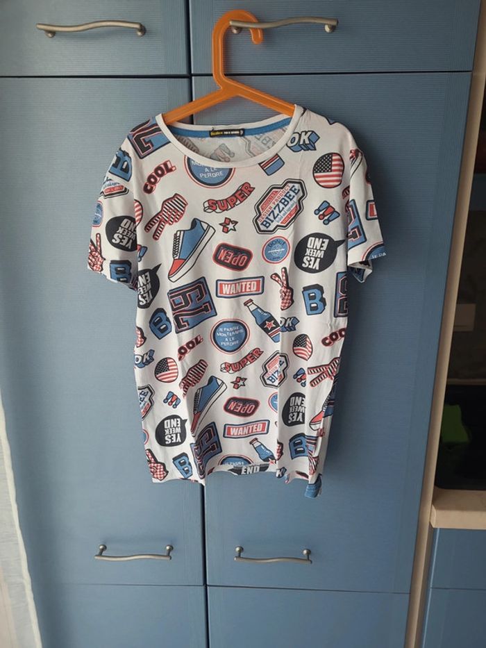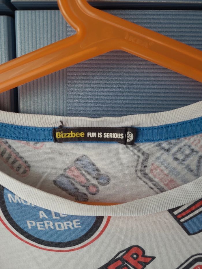 Tee-shirt imprimé Enfant Bizzbee. Manches courtes, couleur blanc, imprimé bleu et rouge. Taille Xs correspond à du 12 ans