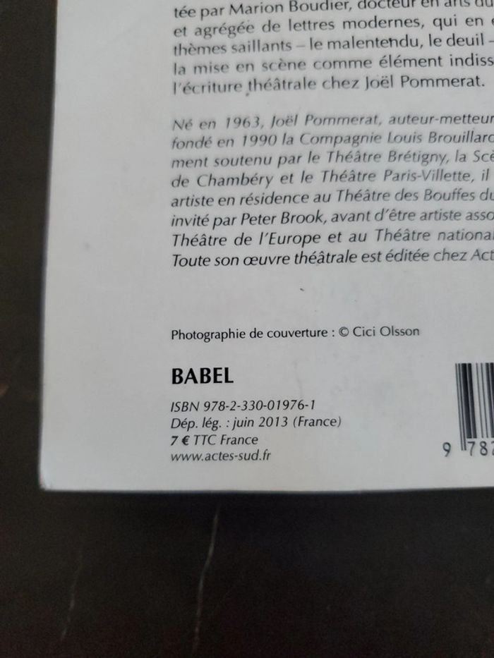 Joël Pommerat. Éditions Babel. Couverture et première page un peu abîmée voir photo.