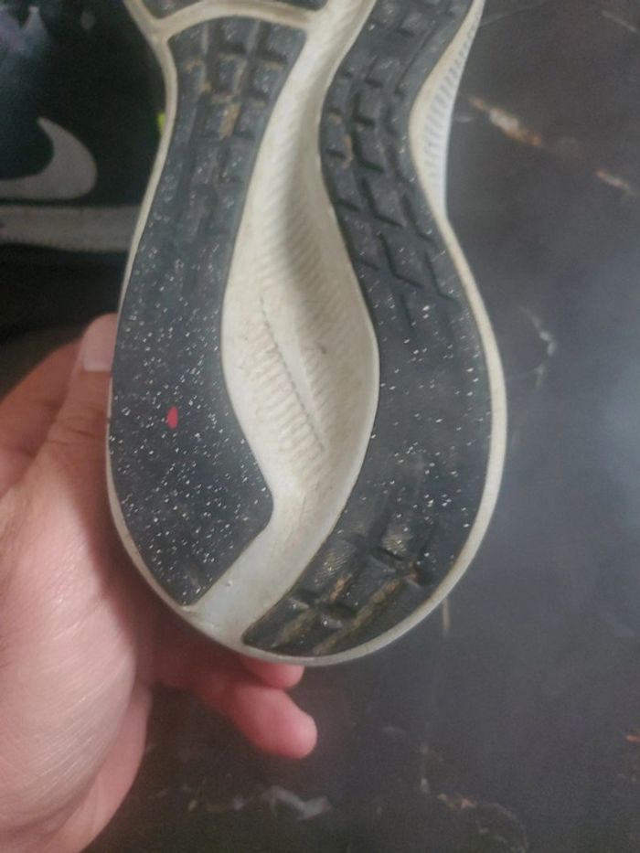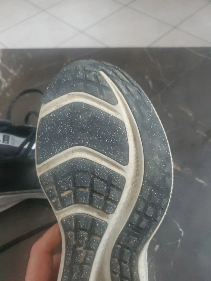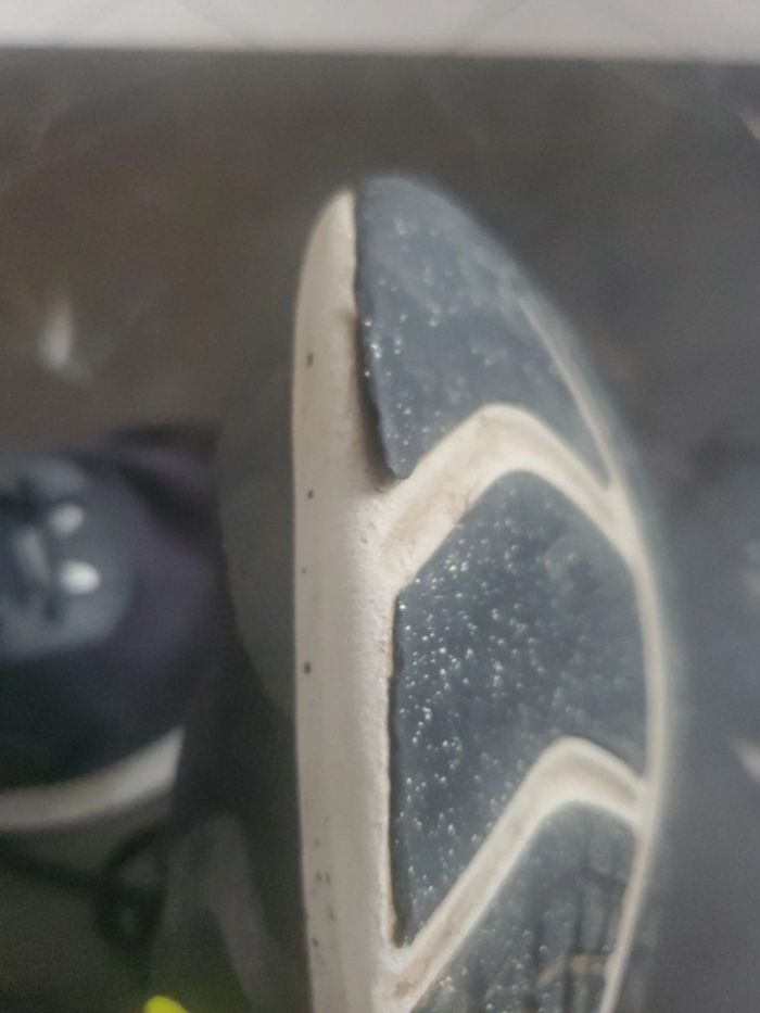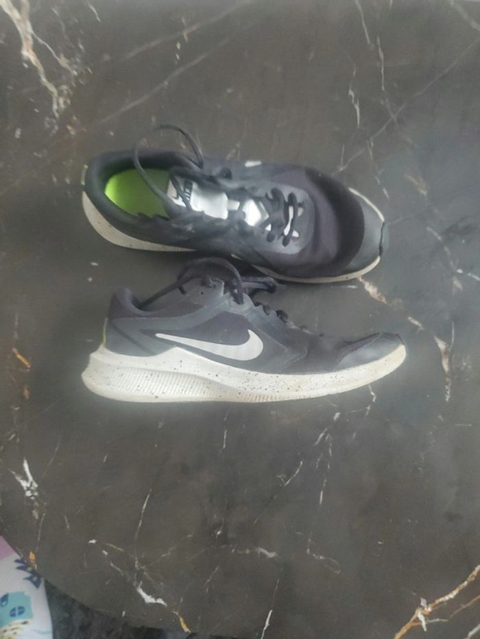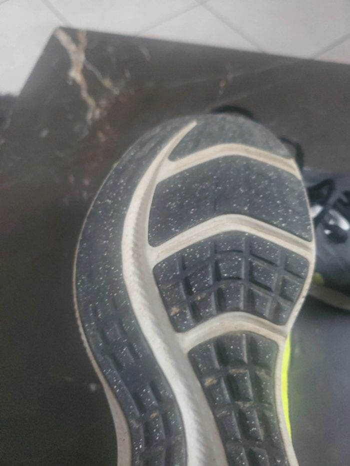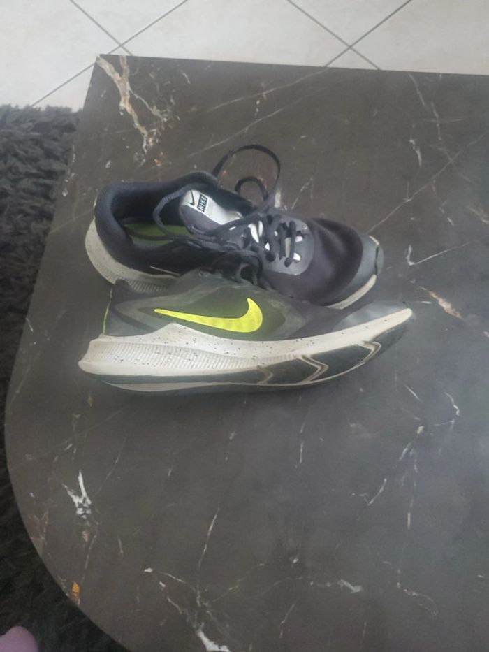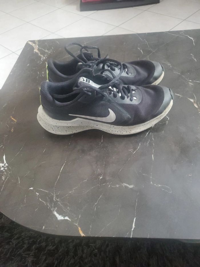 Baskets enfant Nike, noir, avec virgule jaune fluo d'un côté et grise de l'autre. Semelles un peu usées voir état sur les photos. L'une des semelles se décolle un peu voir photo 7. Taille 38