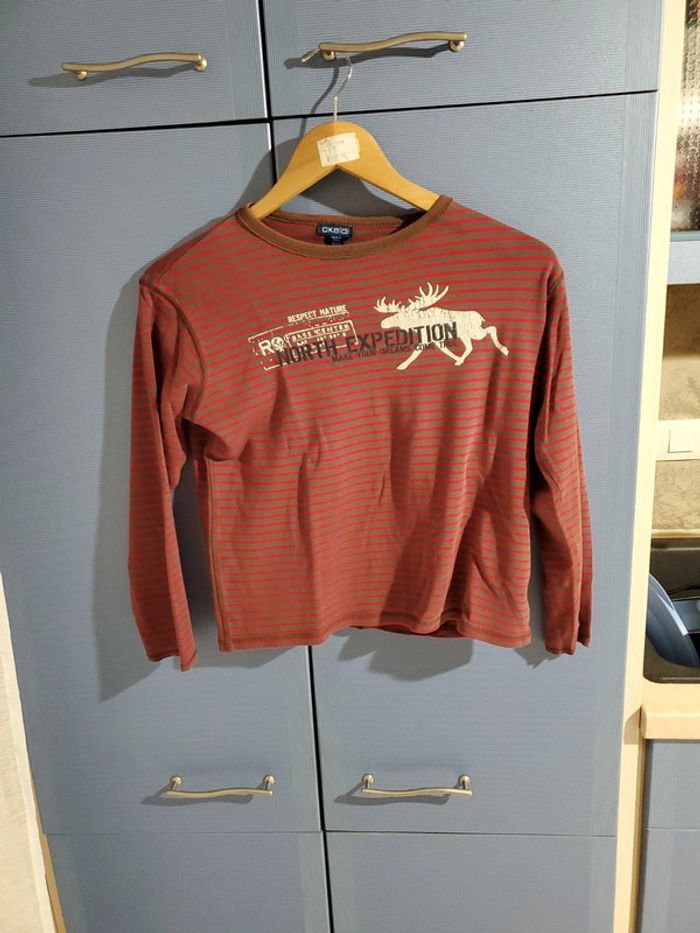 Haut de pyjama Okaidi. Taille 14 ans. Gris rayé rouge , modèle cerf sur le devant.