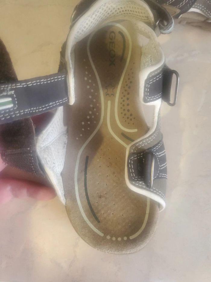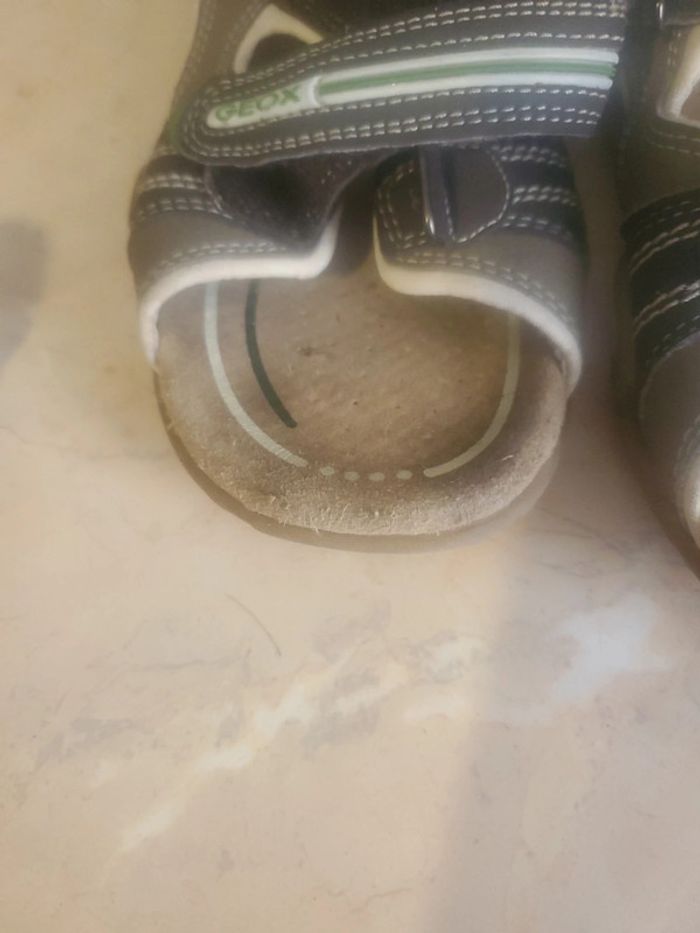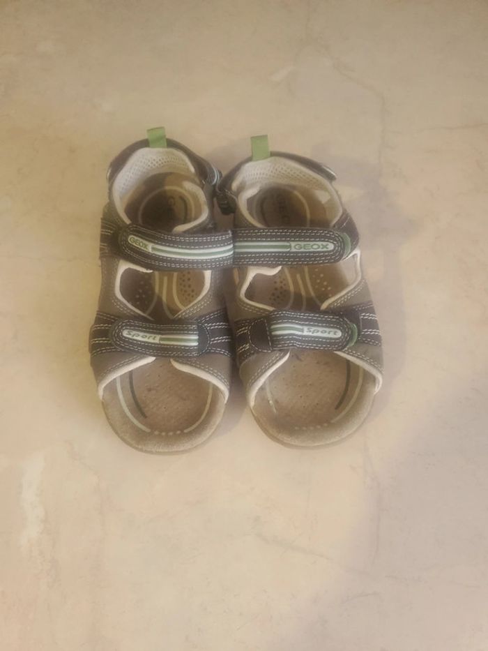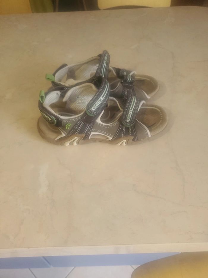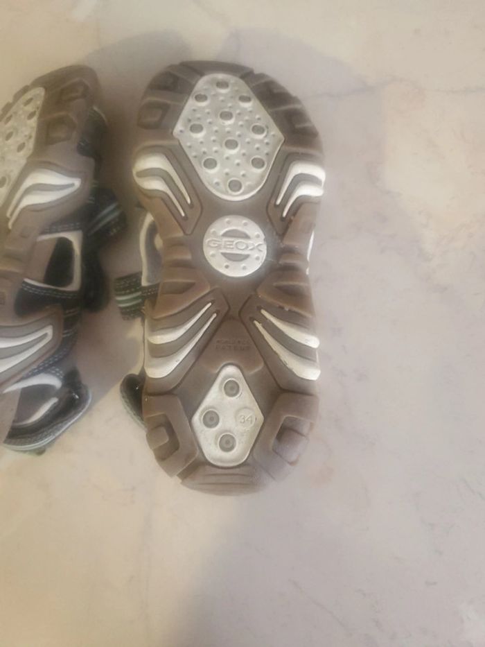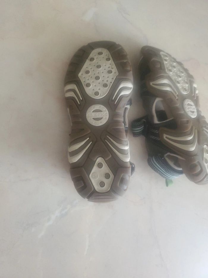 Sandales enfant Geox, taille 34. Couleur marron et vert. Bon état général voir photos peut être un peu usé sur l'avant du pied voir les 2 dernières photos.