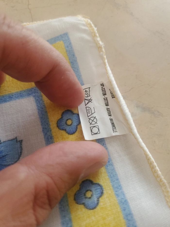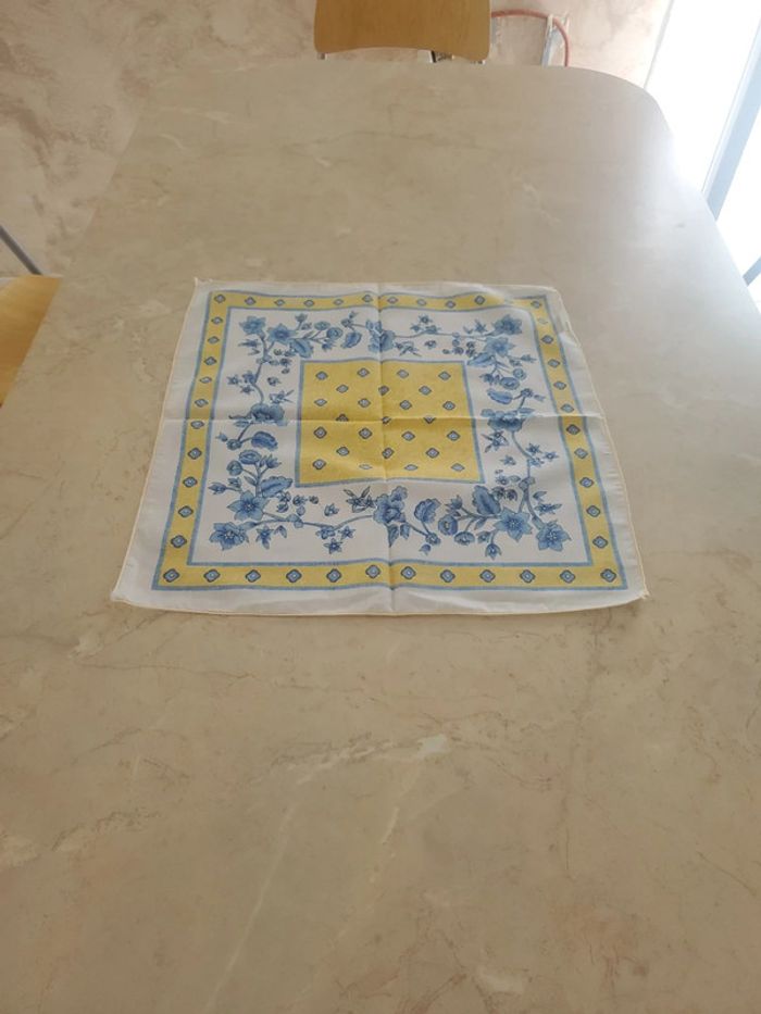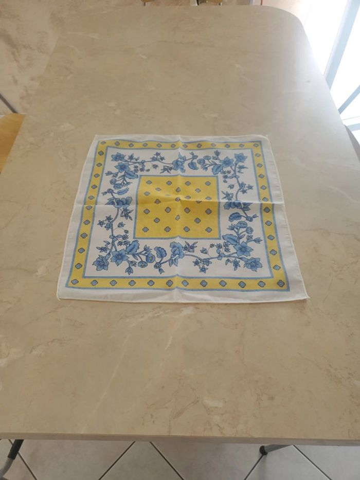 4 serviettes de table. Imprimé fleurs bleues. Couleur bleu, jaune et blanc. Carré de 45 cm. D'autres serviettes dans ma boutique.
