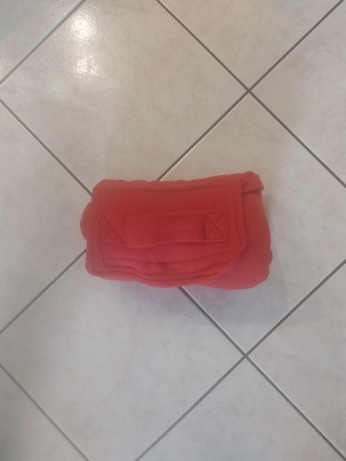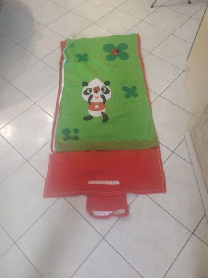 Sac de couchage polaire enfant. 150 cm par 73 cm. Couleur rouge et vert. Motif Panda et coccinelle. La fermeture éclair est cassée donc à changer.