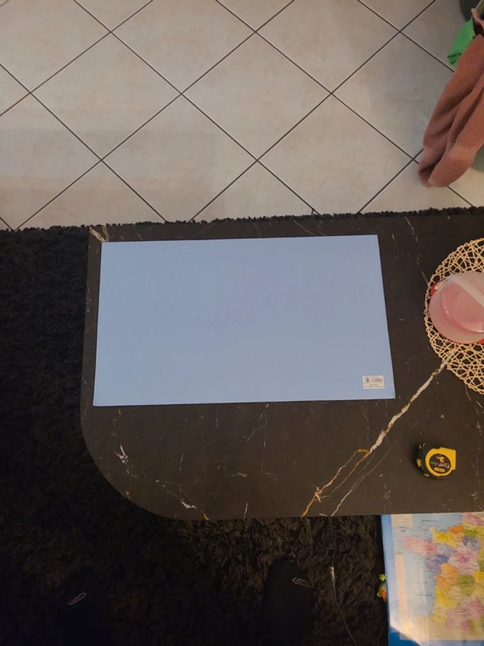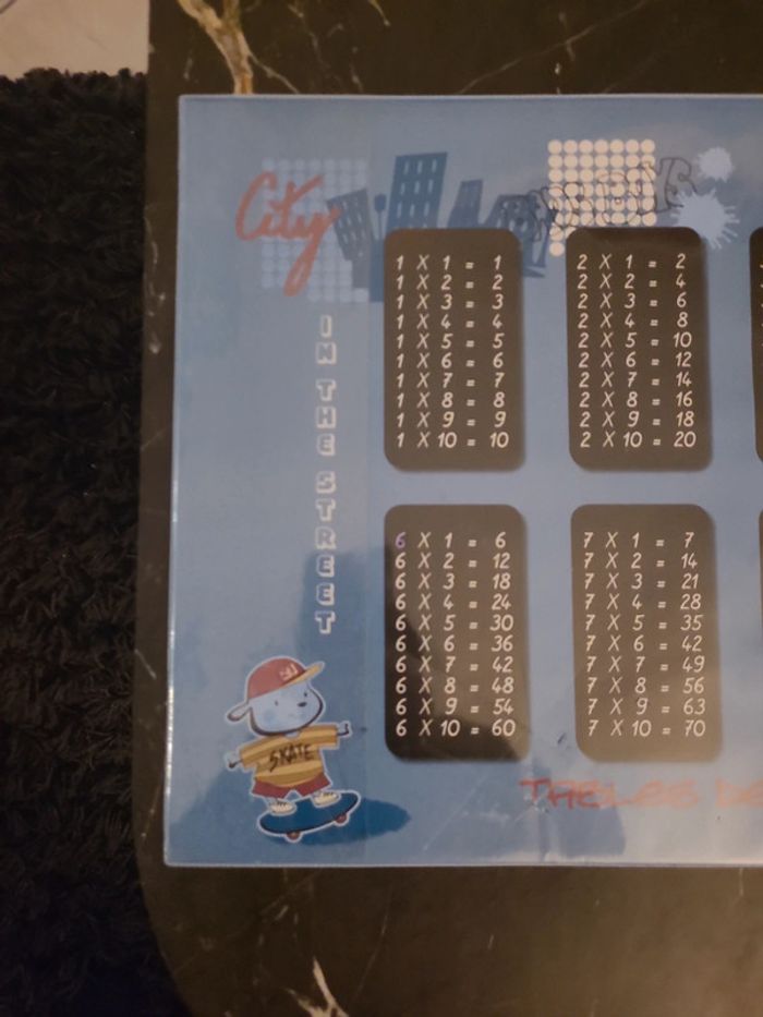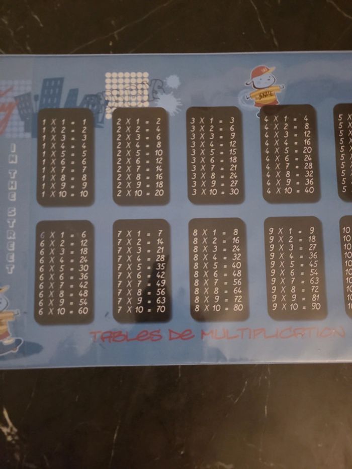 Tables de multiplication, inscrites sur un sous main en plastique. 59 cm par 35cm. Abîmé en bas à droite.