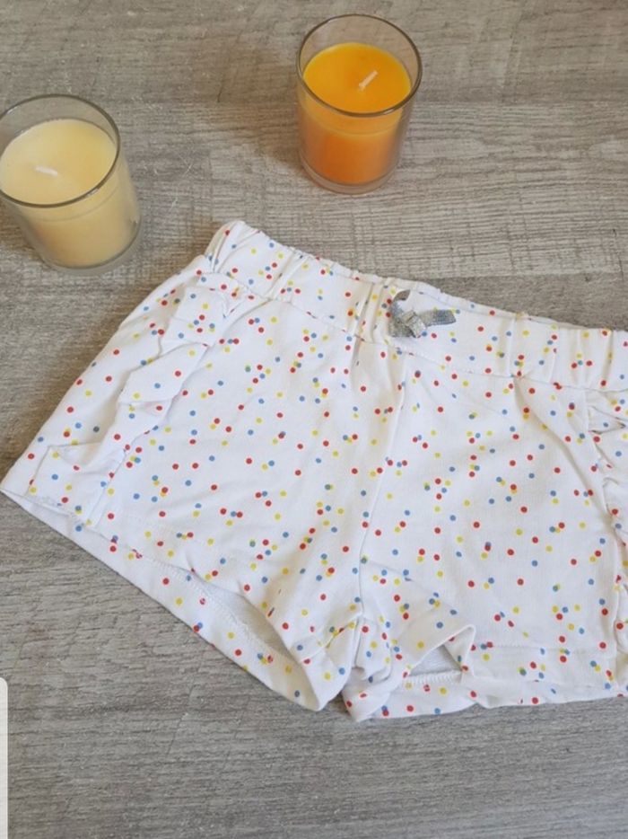 Les trouvailles de Jeanne Short Kiabi en 8 ans. Couleur blanc motifs pois colorés.