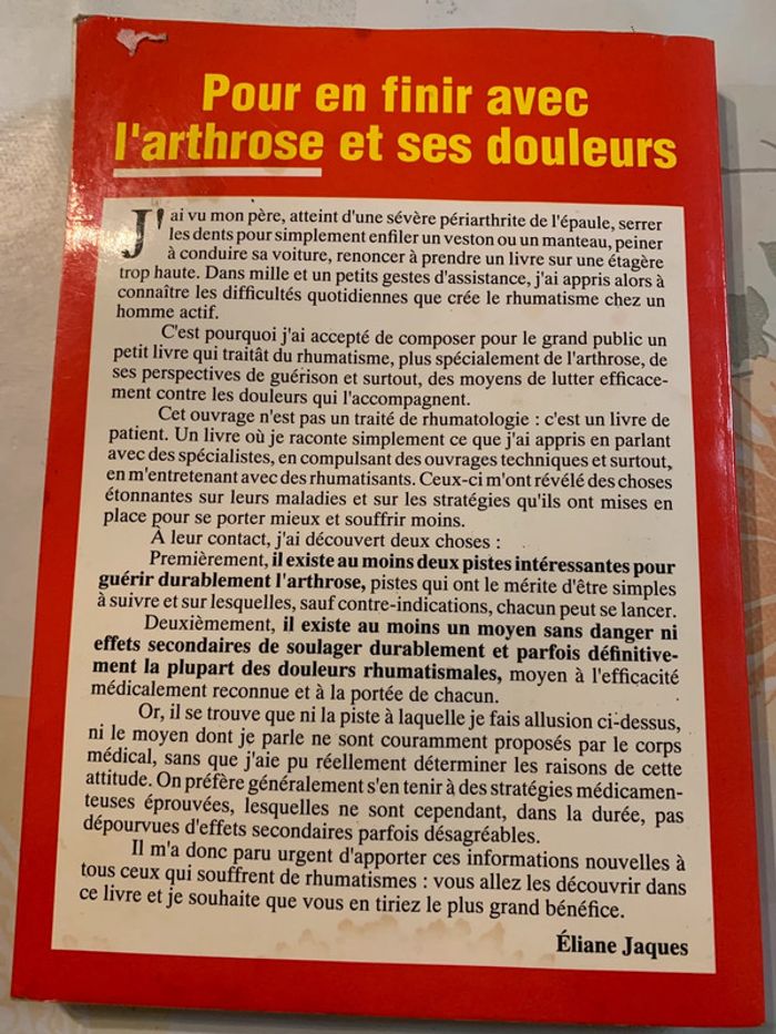 Livre santé / Pour en finir avec l'arthrose et ses douleurs /,Éliane Jaques Livre un peu taché sur le côté, pas gênant.