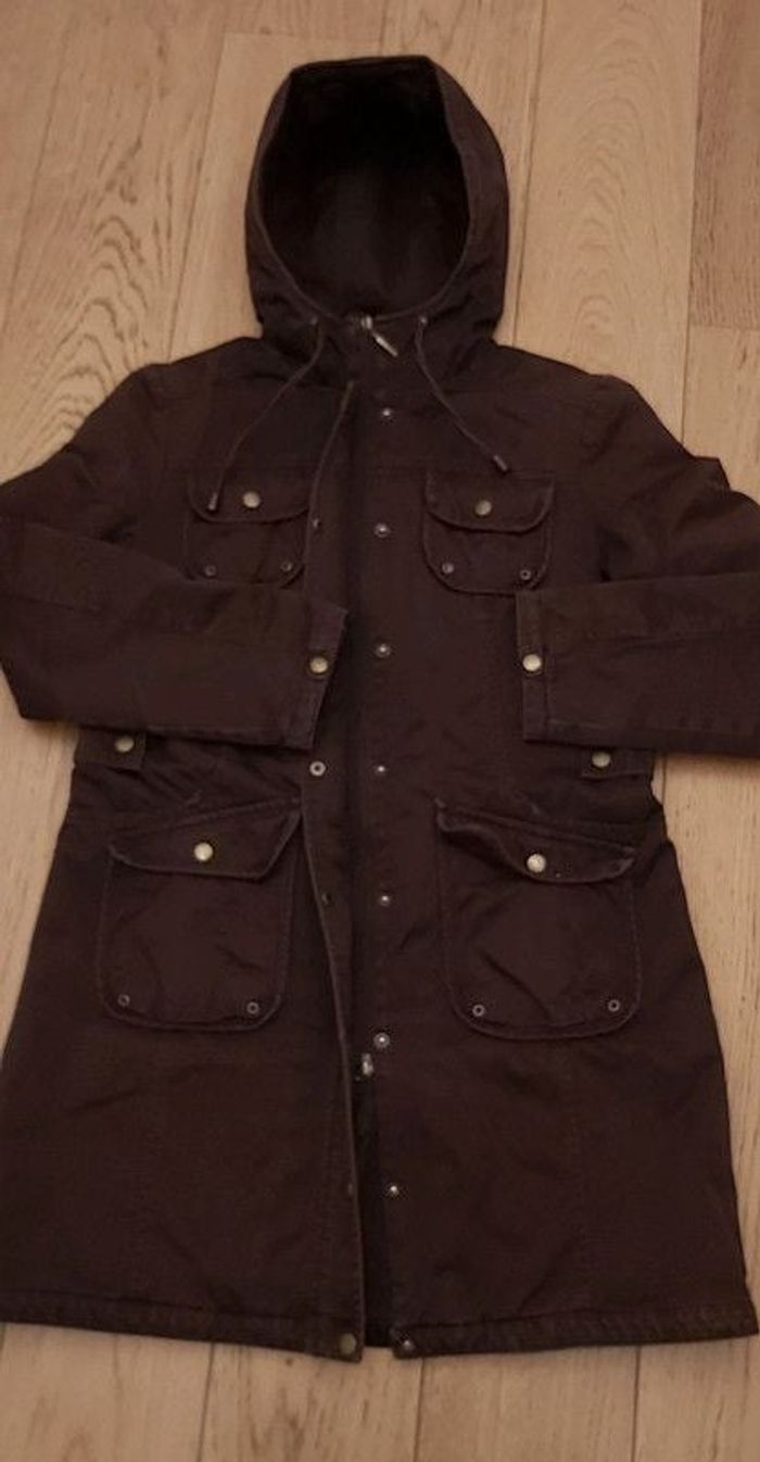 Parka Long à Capuche Camaïeu Taille : 42 Composition : 100% Coton Largeur Épaules : 44 cm Longueur : 90 cm Fermeture éclair et pressions Légèrement décoloré au niveau des manches et fermeture éclair abîmée, mais manteau se ferme voir photos