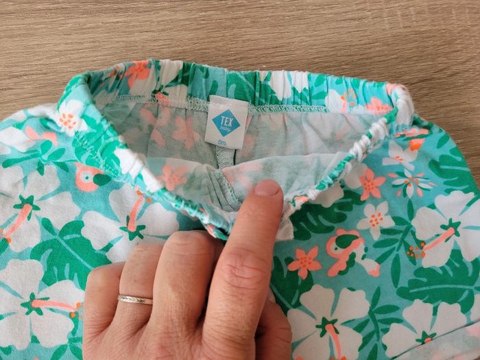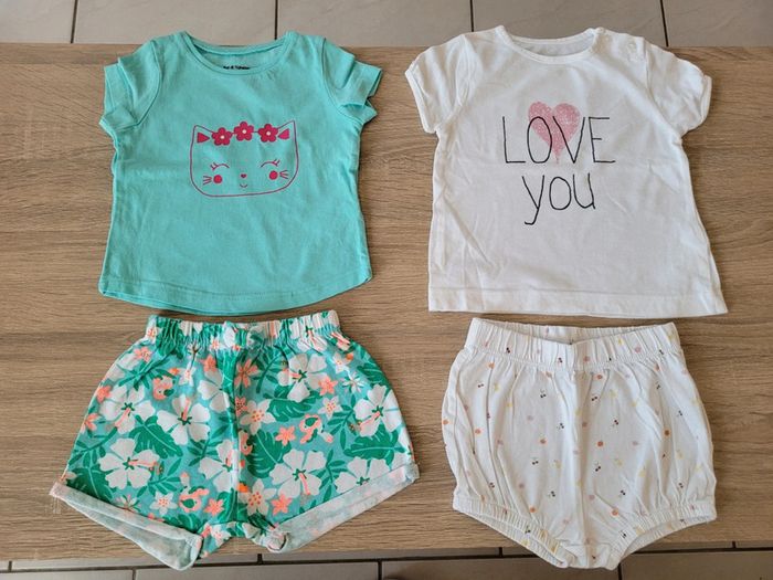 Vend lot de 2 ensembles fille taille 6 mois en très bon état juste un accroc sur le tee-shirt blanc (dû à l'attache de l'étiquette qui était là à l'achat) et le short vert est plus en bon état car plus porté (voir photos). Lot comprenant 2 tee-shirts manches courtes et 2 shorts. Marque Kiabi, Tex, Pat et Ripaton.
