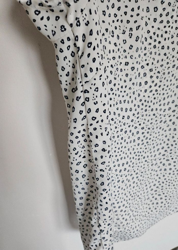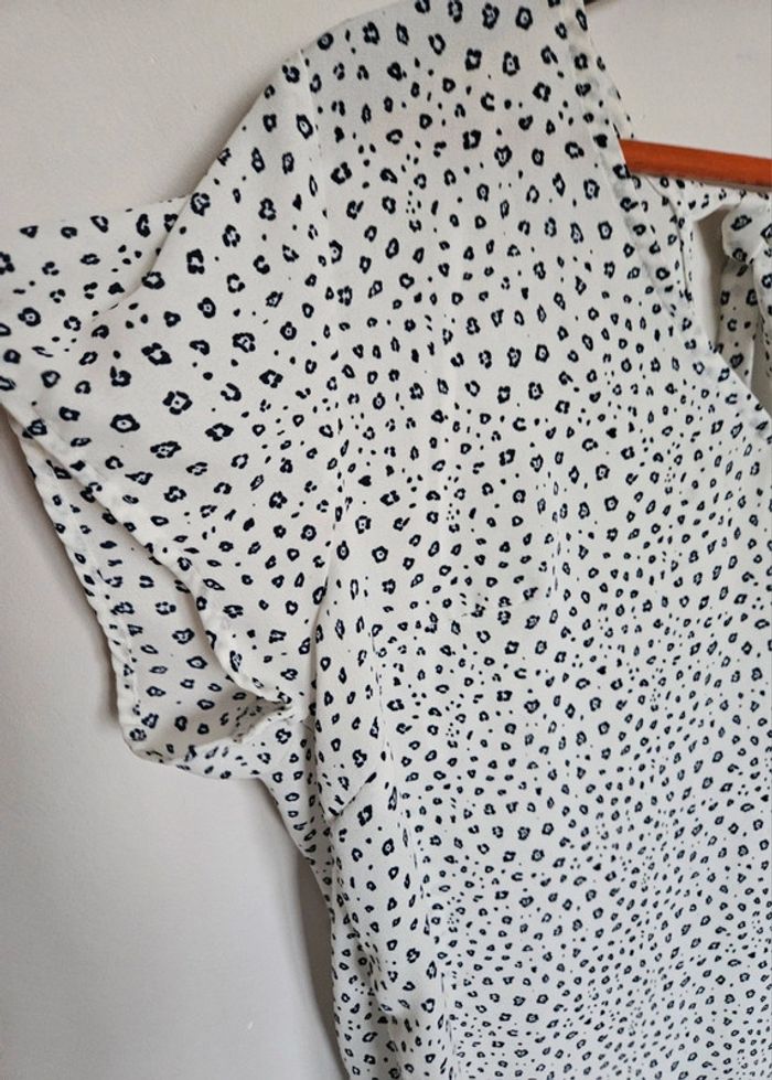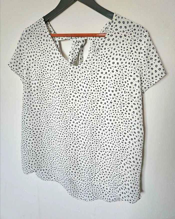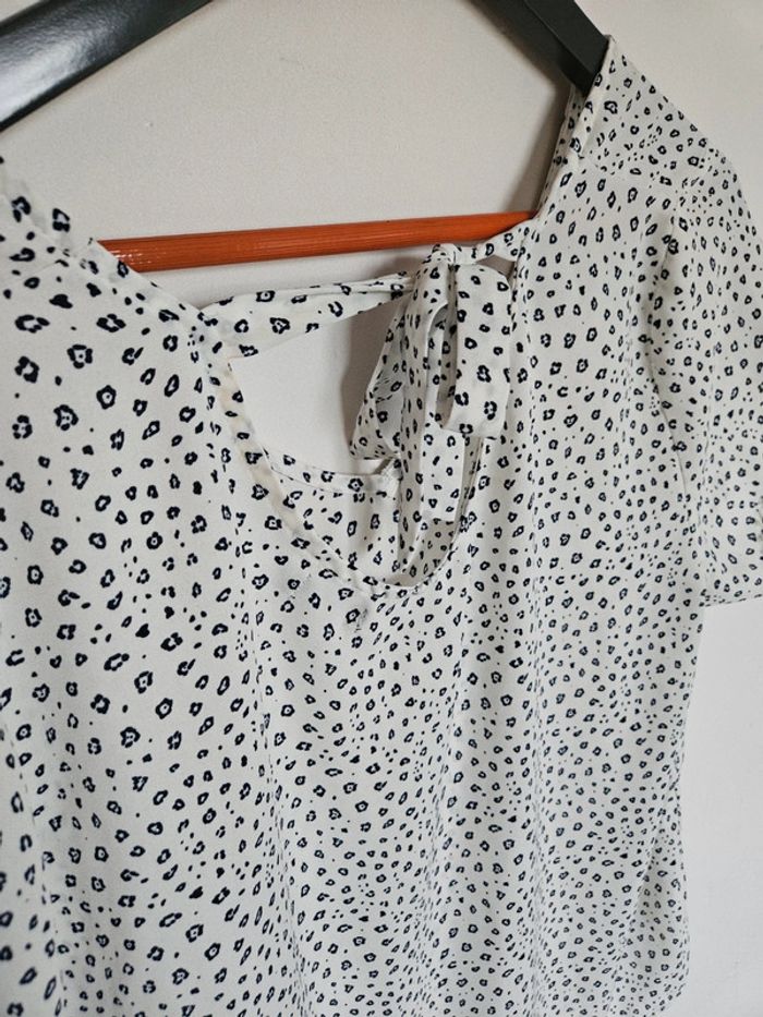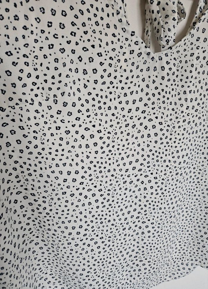 Blouse blanche à fleurs bleu, manche courte, lien à nouer en haut du cou, très fluide