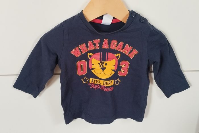 Bonjour, Je vends ce t-shirt ML pour garçon en taille 6 mois de la marque C&A en très bon état