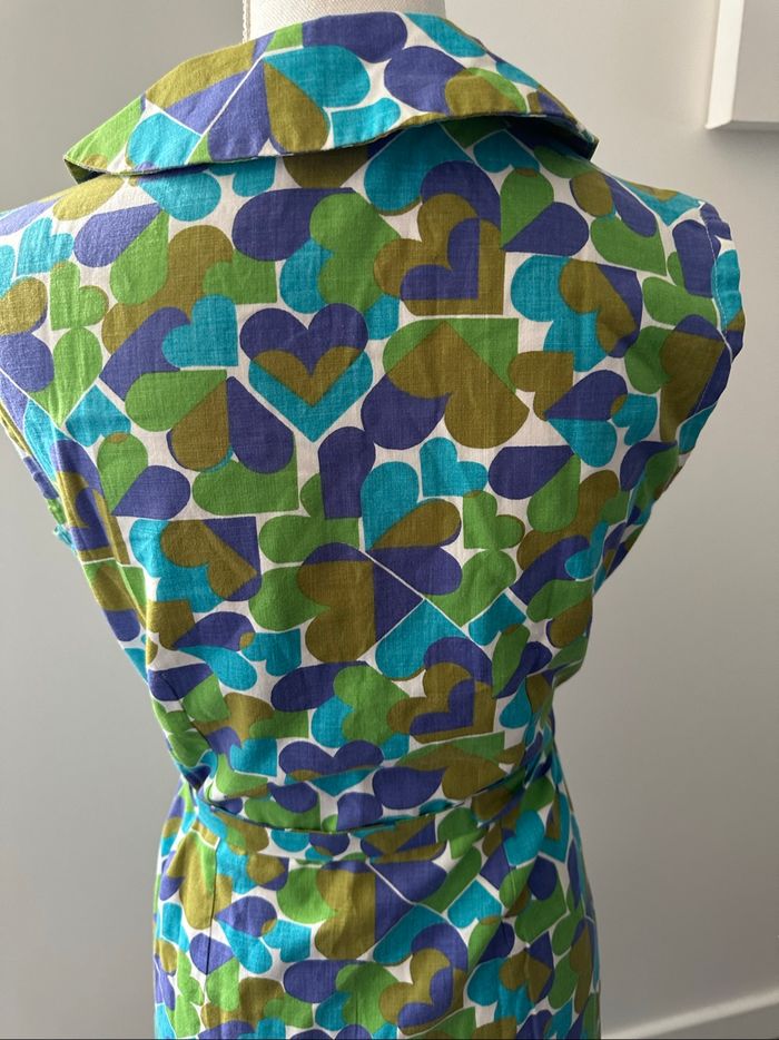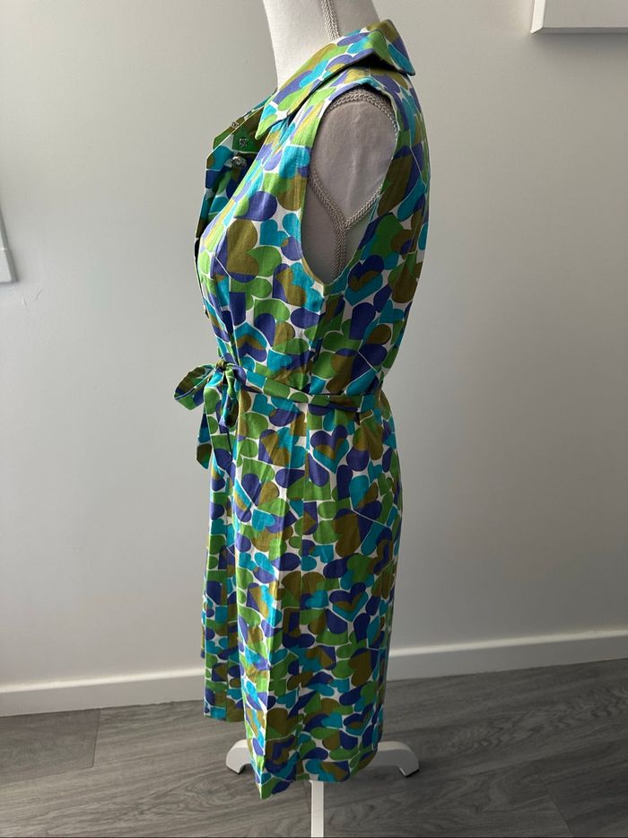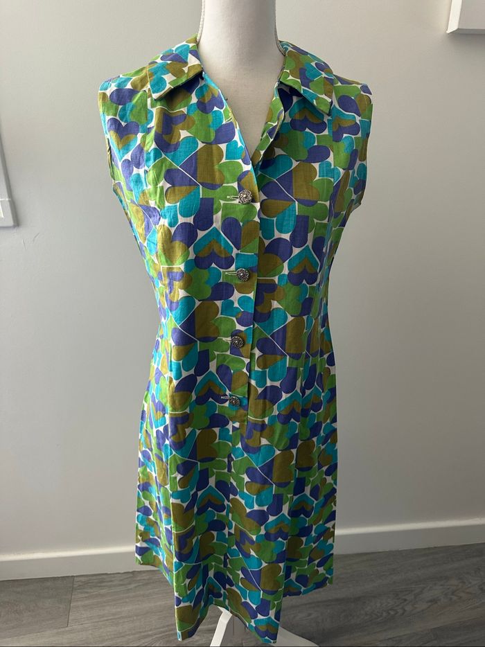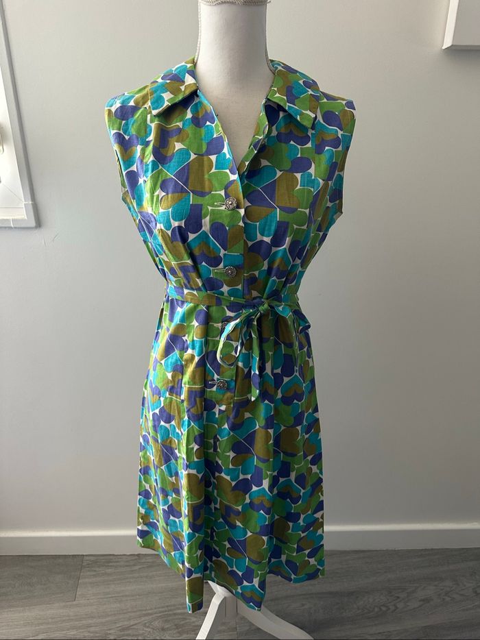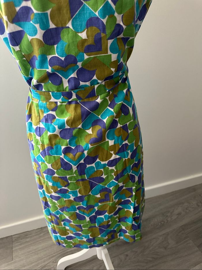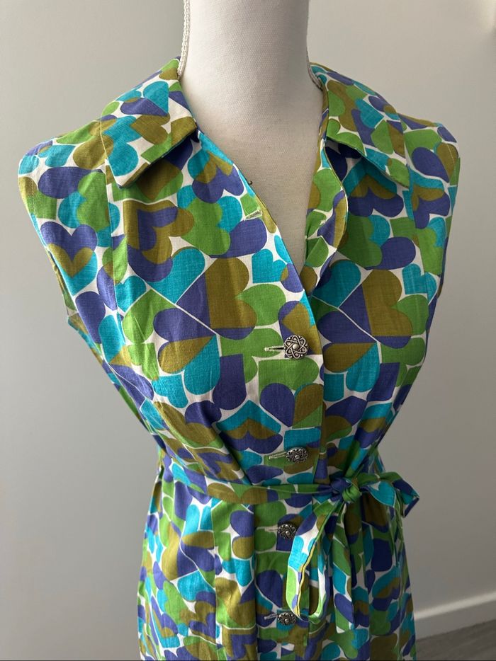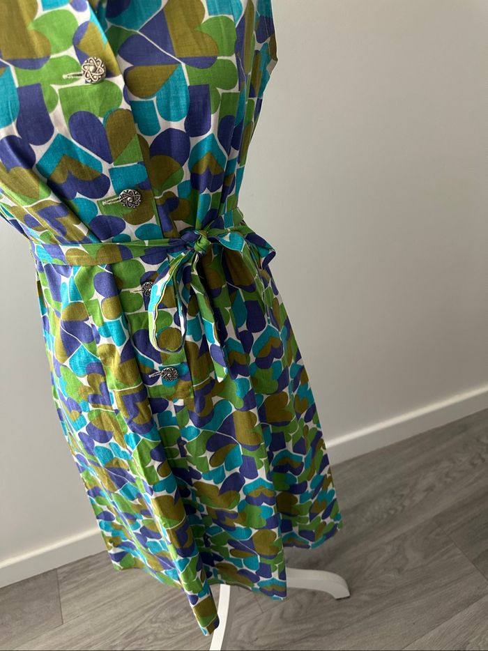 Robe - Excellent état - Taille 36 équivalent S Dimensions en bas de l’annonce - Imprimés petits cœurs - Se ferme avec des boutons - Verte, kaki, bleue marine, bleue et blanche - Se ferme avec des boutons - Sans manche - Avec une ceinture - Vintage, années 60- 70’ Sixties, Seventies - Fabrication française 🇫🇷 - Prince, Reims - Pas d’étiquette de matière Dimensions: - 47cm niveau aisselles - 92cm de long L’étiquette indique une taille 42 mais les dimensions correspondent à du 36.