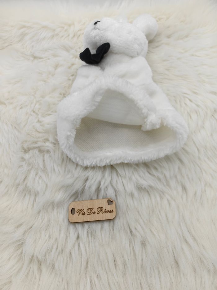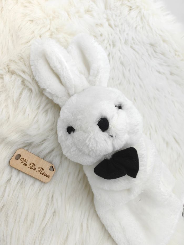 Doudou peluche marionnette Lapin blanc noeud papillon noir.
