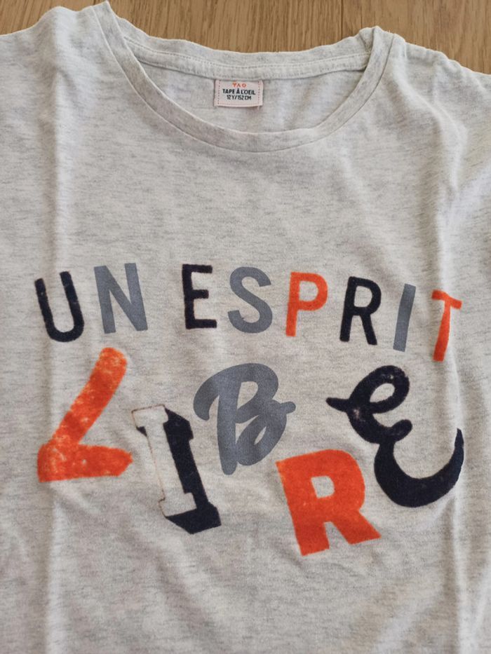 Vends lot de 9 tee-shirts à manches longues en 12 ans de chez TAO. Excellent état. Uniquement sur le tee-shirt (dernière photo), "un esprit libre ", sur le libre le velours est très légèrement parti à certains endroits.