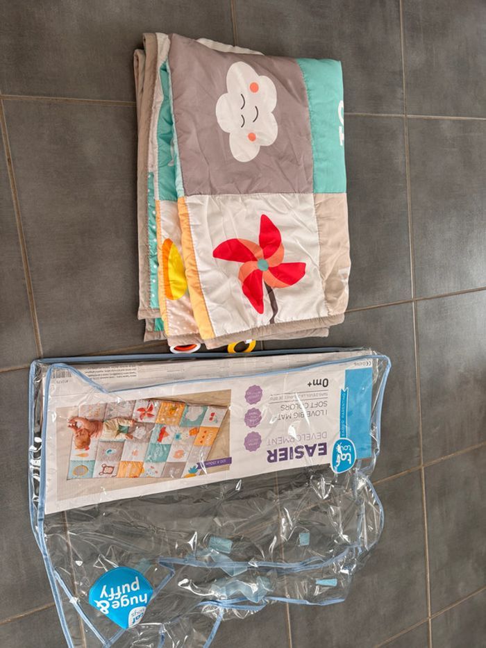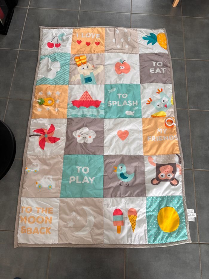 Grand Tapis d’eveil Marque taf toys Plusieurs anneaux de dentition, bruissement et forme. A partir de la naissance (0+) Taille: 150cm x 100cm Lavable en machine Transportable Avec son sac Manque juste le miroir détachable Acheté 55€