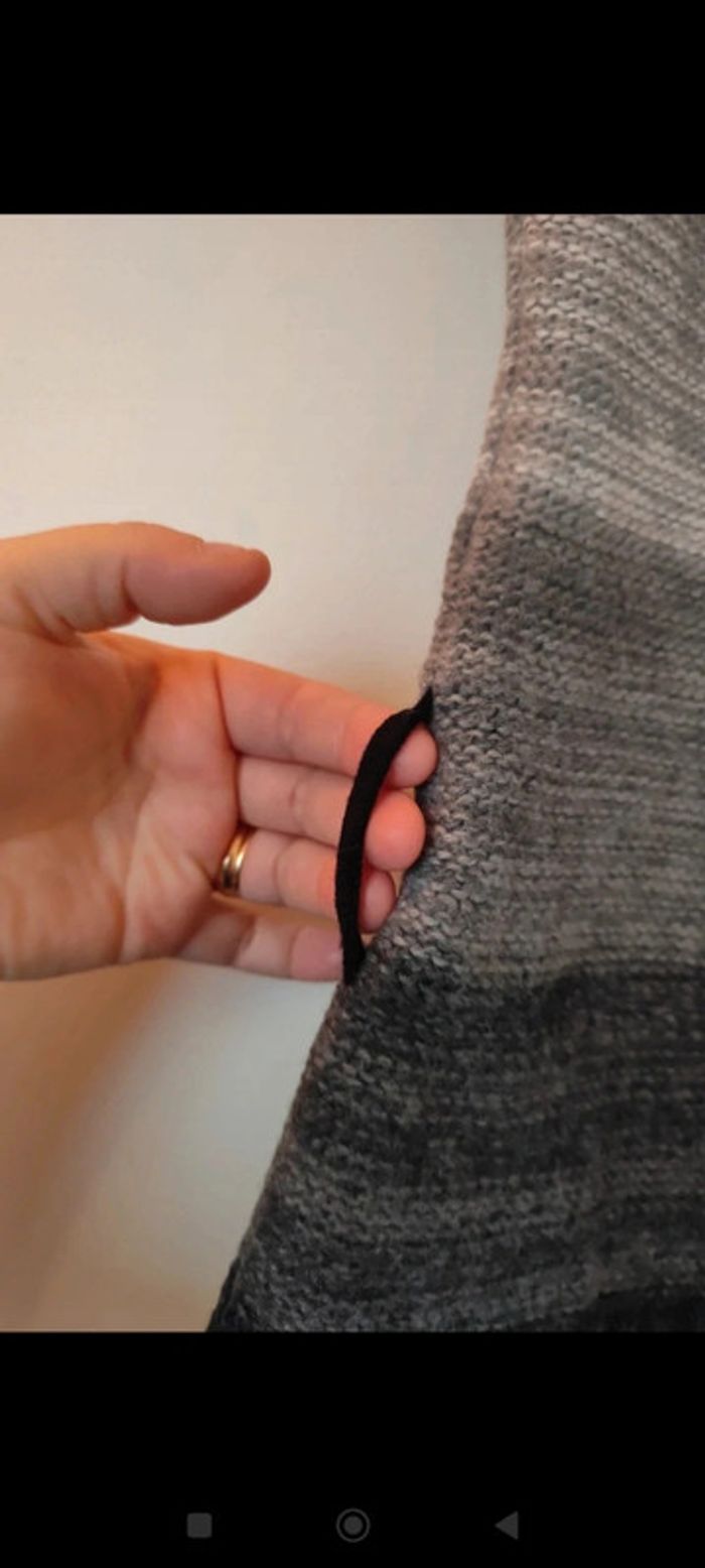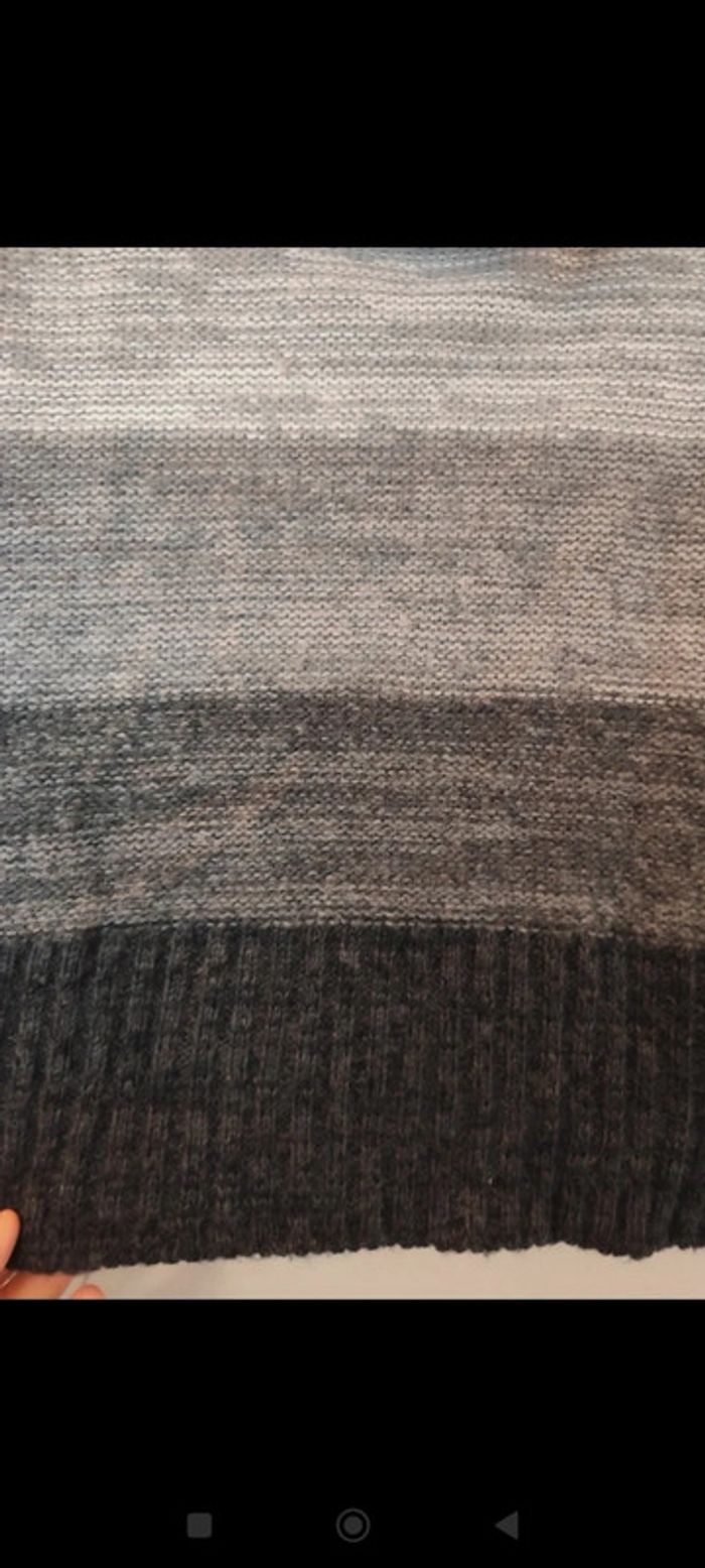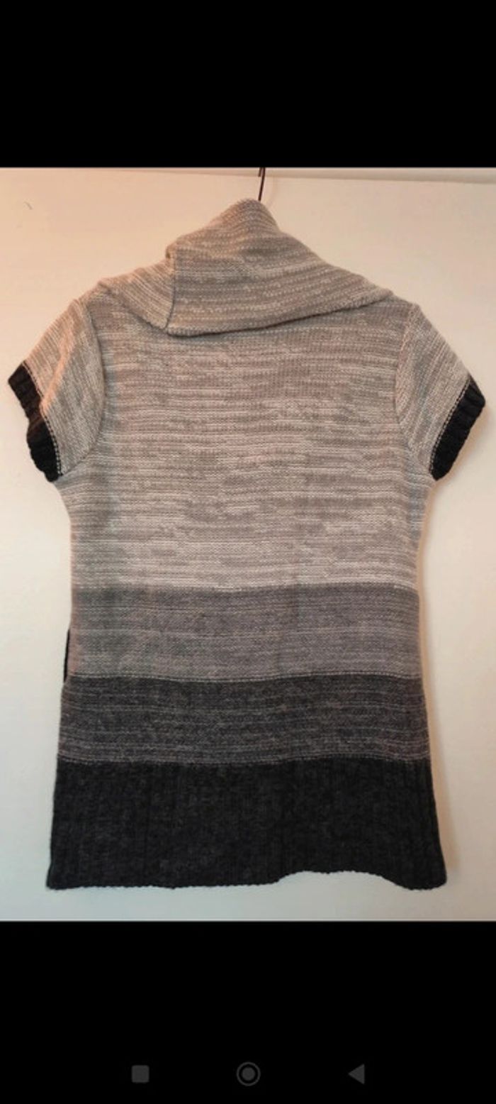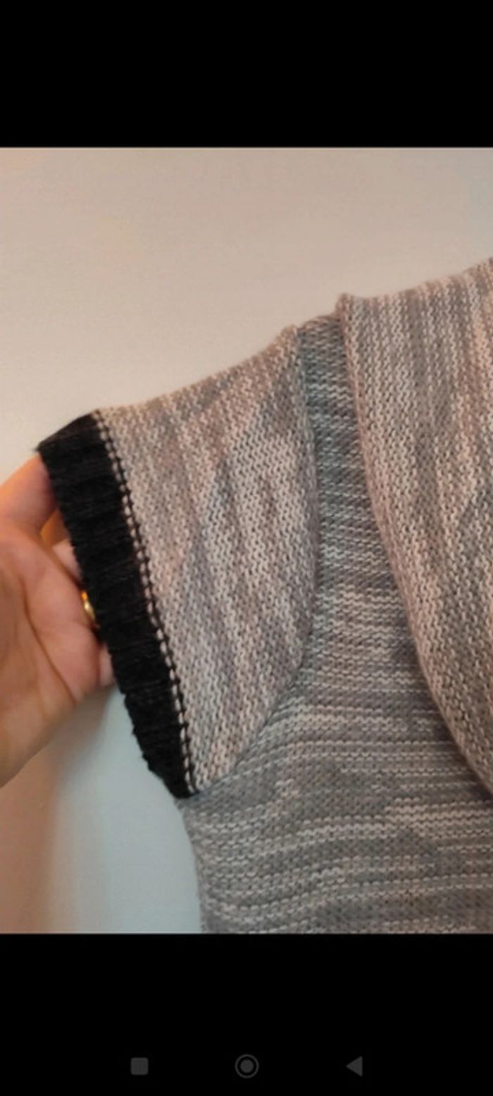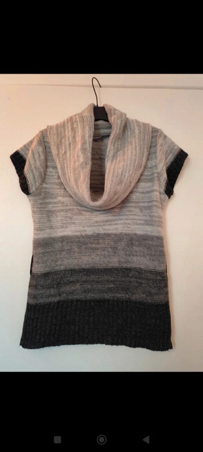 #femme38samcec1802 Pull en laine manches courtes, col évasé. Dégradé gris clair/gris foncé/noir. Tissu doux et extensible. Trou pour mettre une ceinture pour ceintrer. Taille 2 équivalent 38/40 Patrice Bréal #pullbreal38 #pullsansmanche #pulllainefemme #pullpatricebreal38
