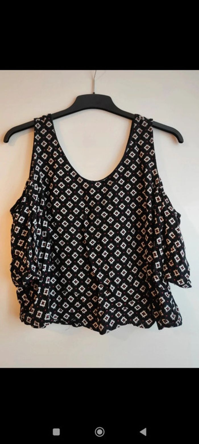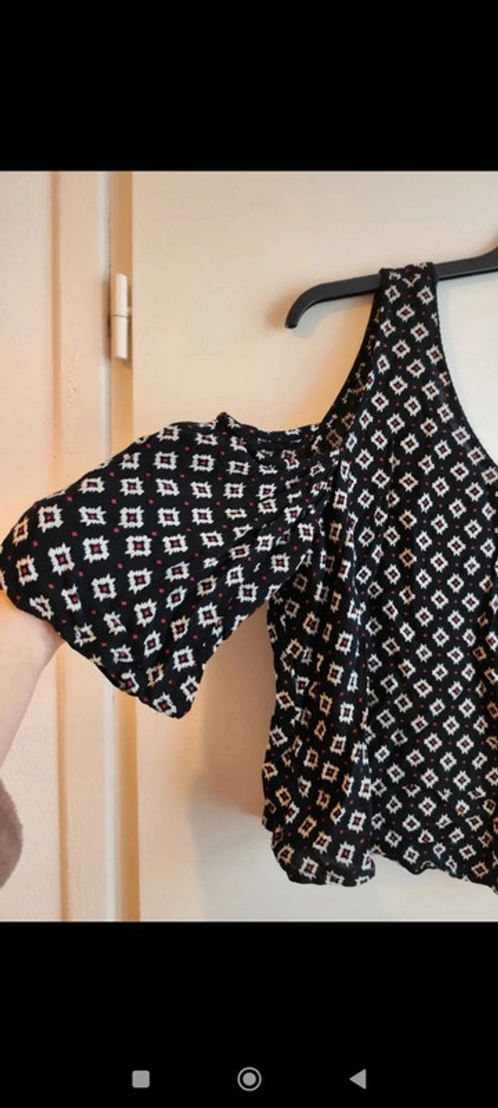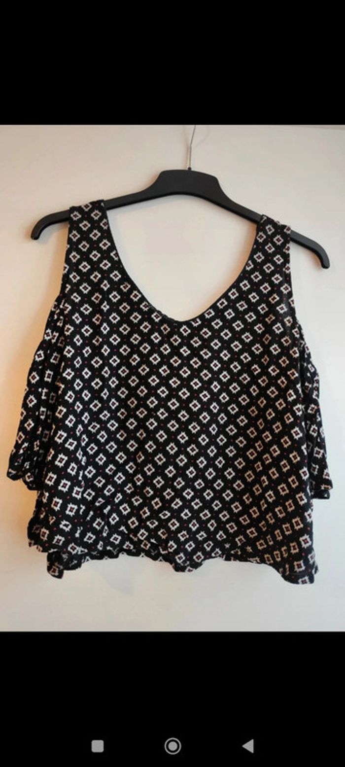 #femme36samcec1802 #femme38samcec1802 #femme40samcec1802 Top fluide noir à motifs, épaules dénudées. Taille S mais il est large il peut convenir jusqu'au L sans pb Jennyfer