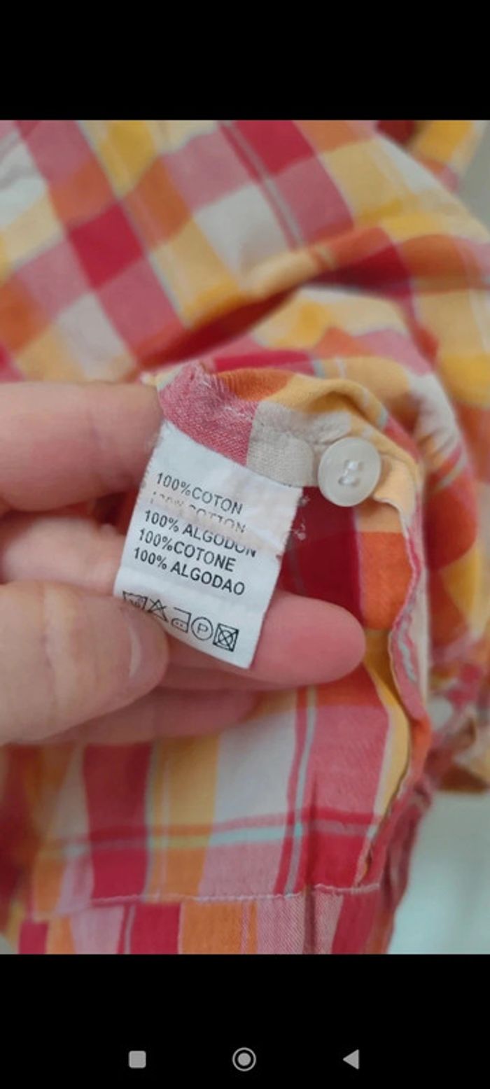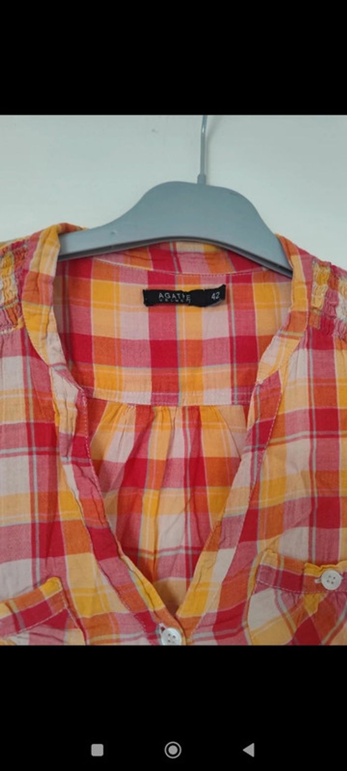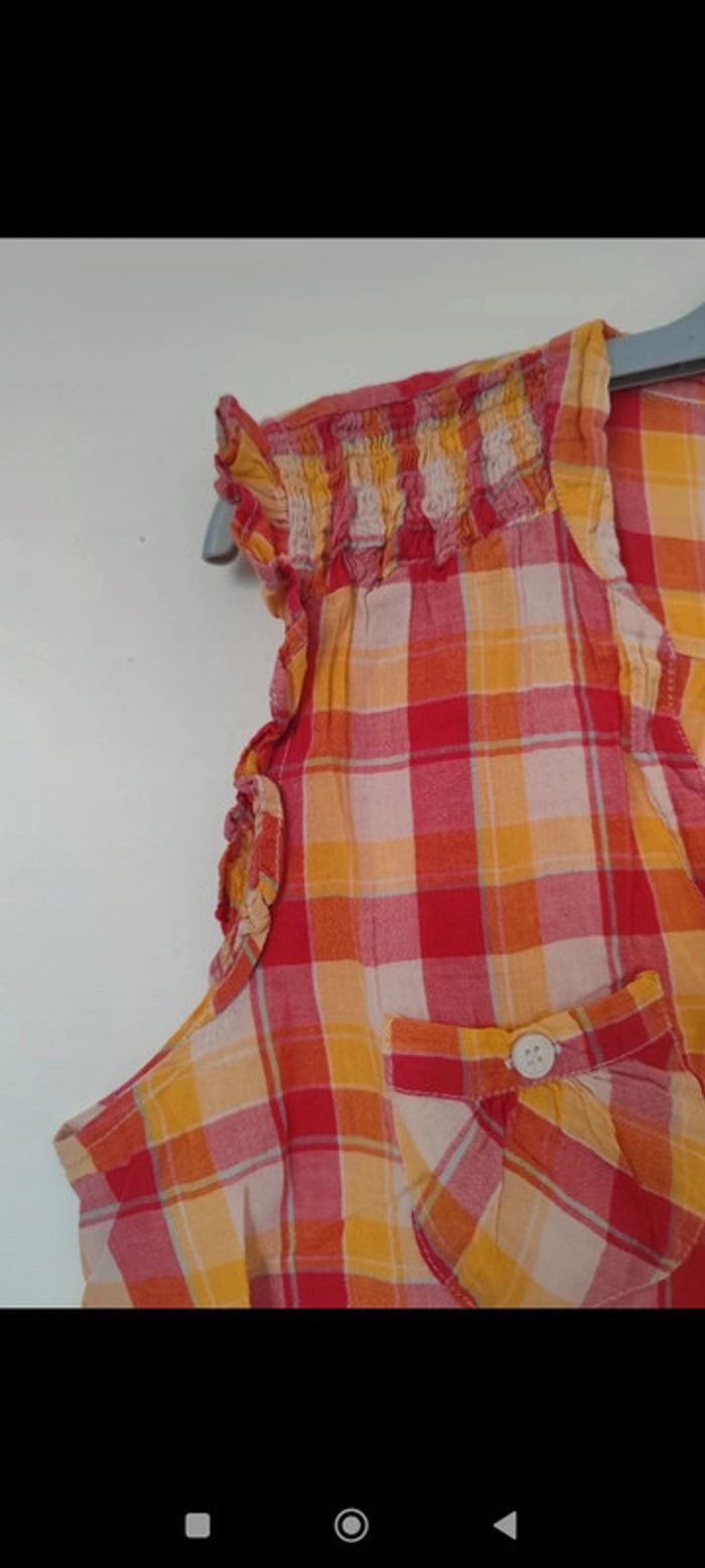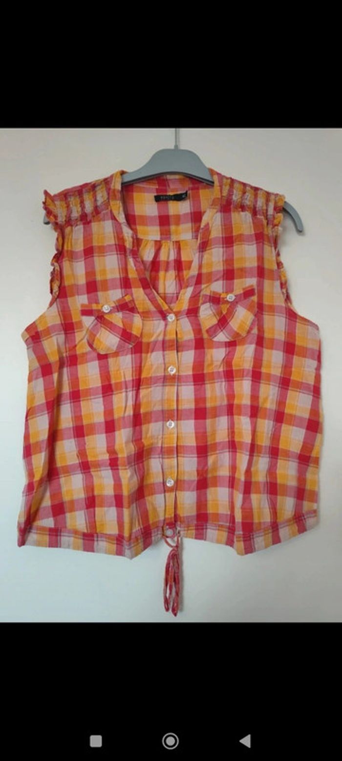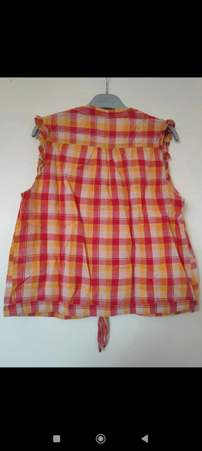 #femme42samcec1802 Top court, débardeur large, qui se resserre à la taille via un cordon, boutonné sur toute la longueur. Carreaux colorés rouge/orange/jaune (dégradé de couleurs) Petit frou frou au niveau des épaules. 100% coton Taille 42 Agathe Velmont