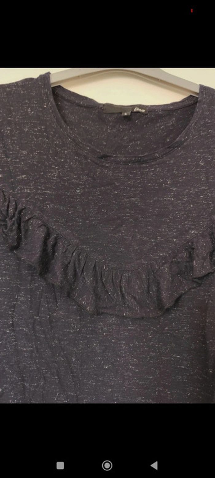 #femme40samcec1802 Tee shirt bleu marine à paillettes argentées, petit volant au niveau de la poitrine. Taille L Tissu extensible Etam