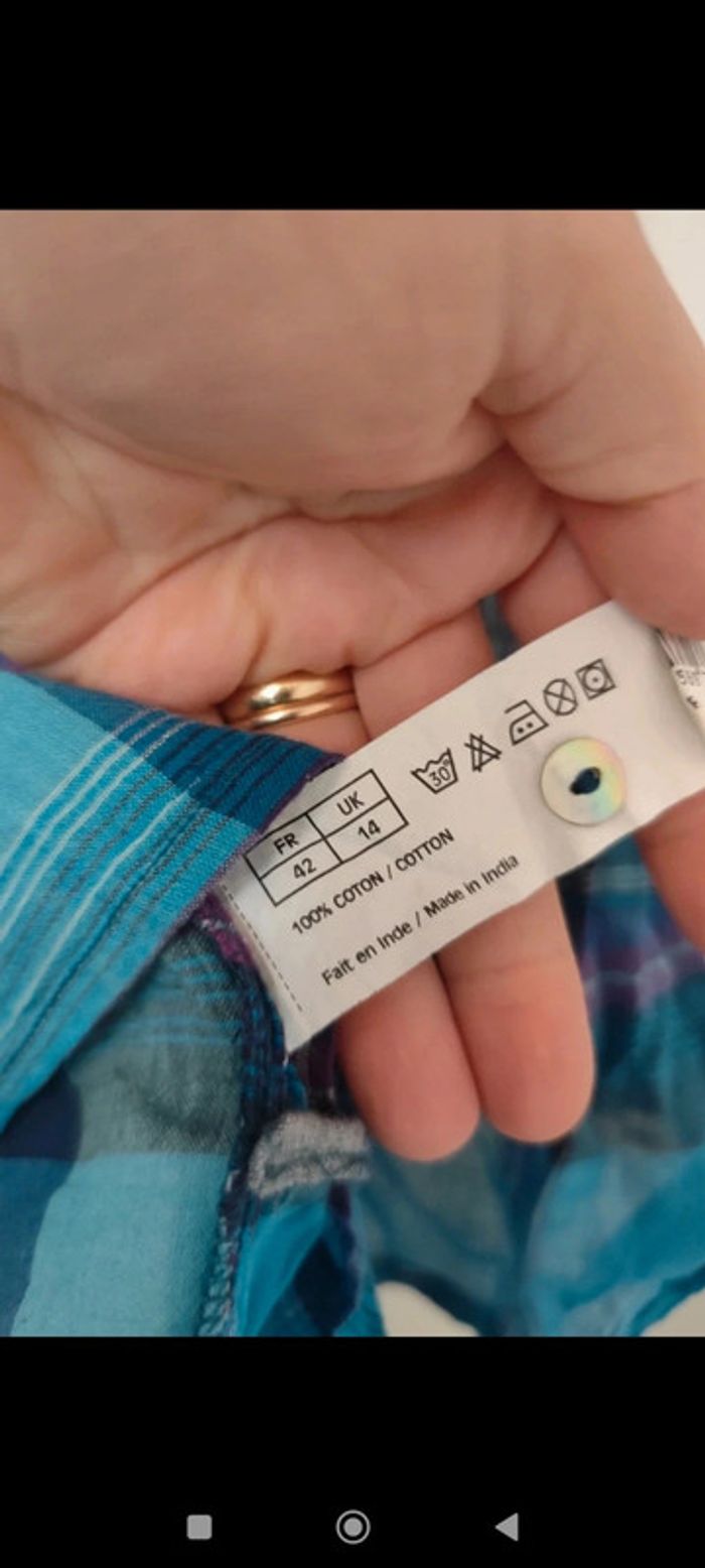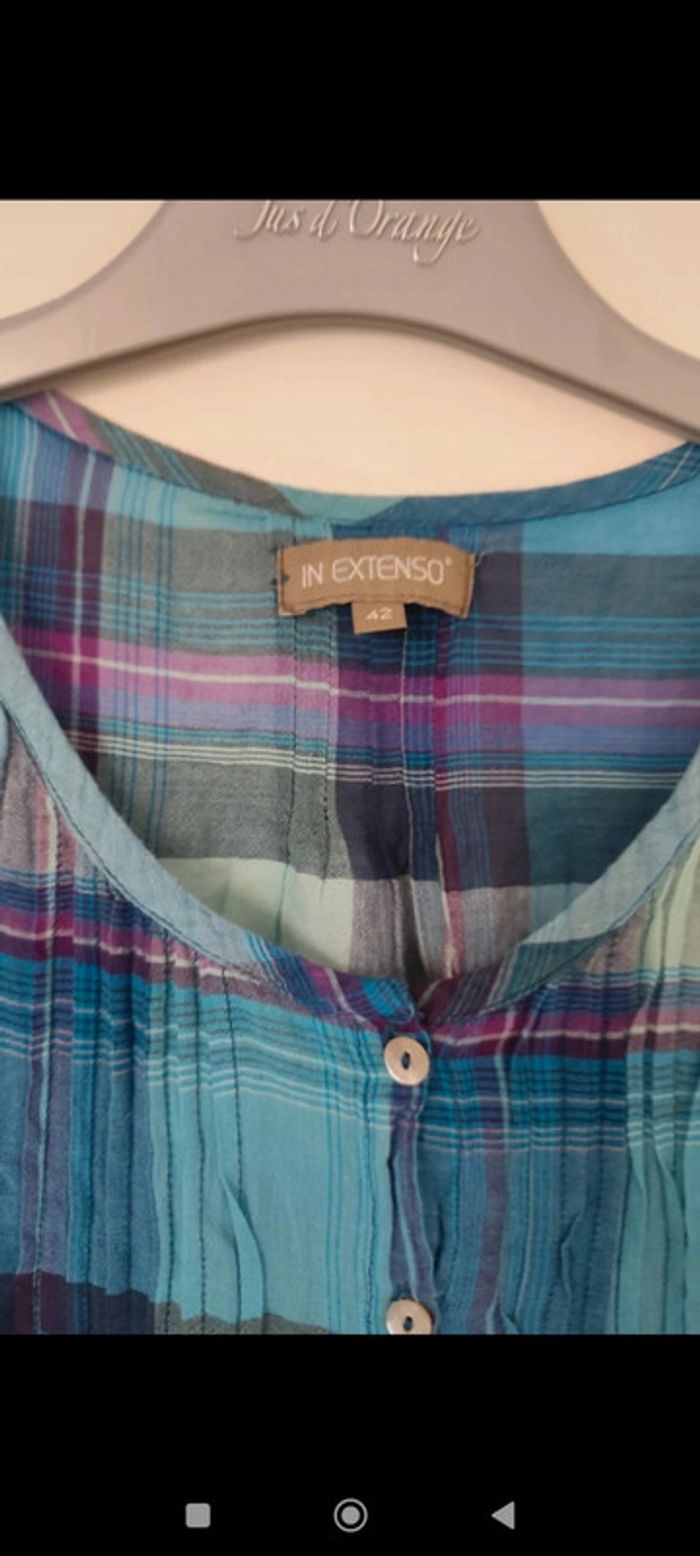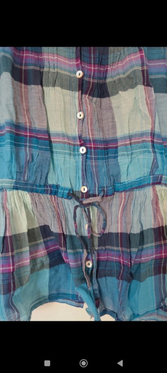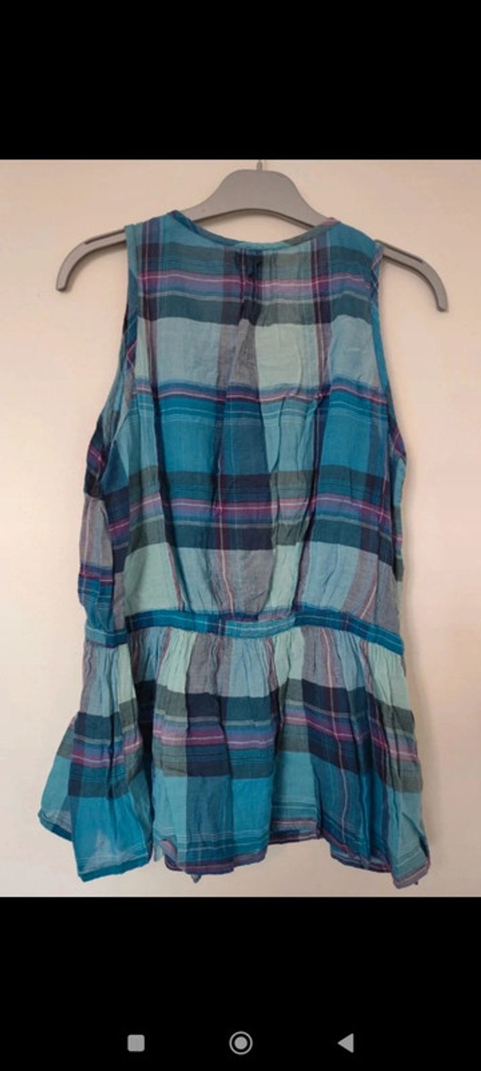 #femme42samcec1802 Débardeur chemise fluide, boutonné sur toute la longueur. Effet plissé (voir photo) Cordon au niveau de la taille pour ceintrée puis part en évasé. Tissu non extensible (n'hésitez pas si besoin des mesures). Taille 42 In extenso