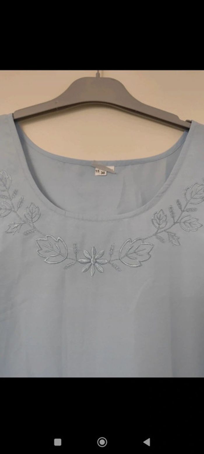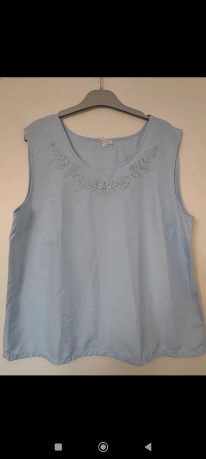 #femme46samcec1802 Débardeur classique bleu clair avec motif fleuri au niveau de la poitrine. Tissu très léger et non extensible Style vintage 100% polyester Taille 46
