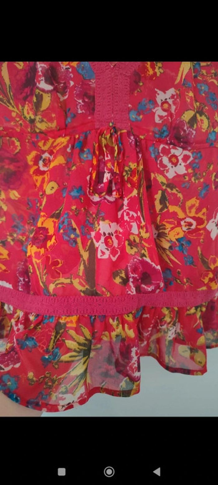 #femme38samcec1802 Blouse fleurie en voile transparent, à courtes manches. Couleur rouge et autres. Dentelle + cordon pour resserrer sous la poitrine. Tissu non extensible mais fluide. Taille 38