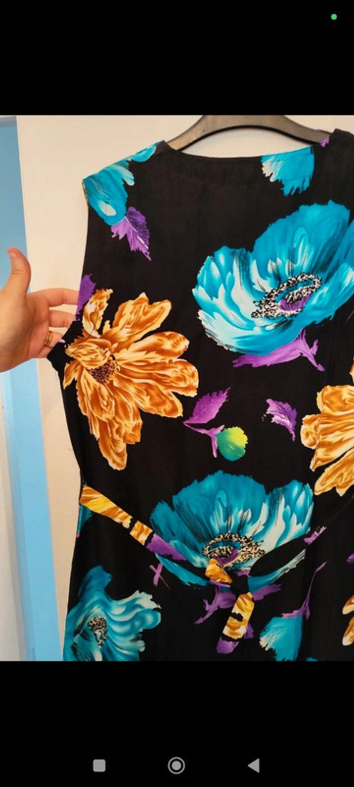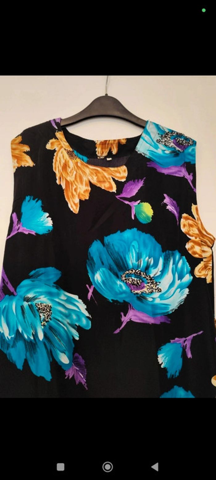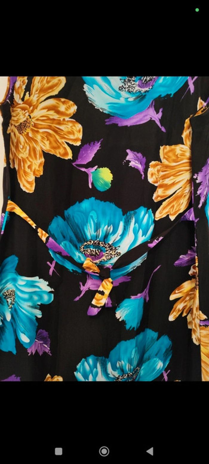 #femme44samcec1802 Très jolie longue robe noire sans manches, motifs grosses fleurs multicolores. Petite ceinture en tissu pour serrer à la taille. Tissu fluide mais non extensible. N'hésitez pas si besoin des mesures. Taille XXL équivalent 44