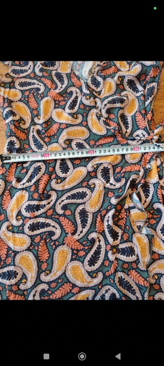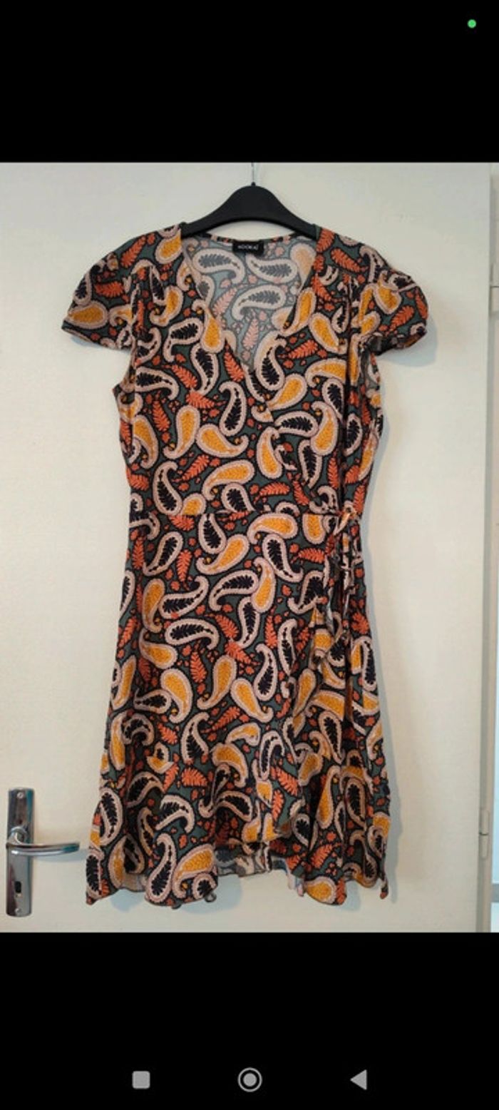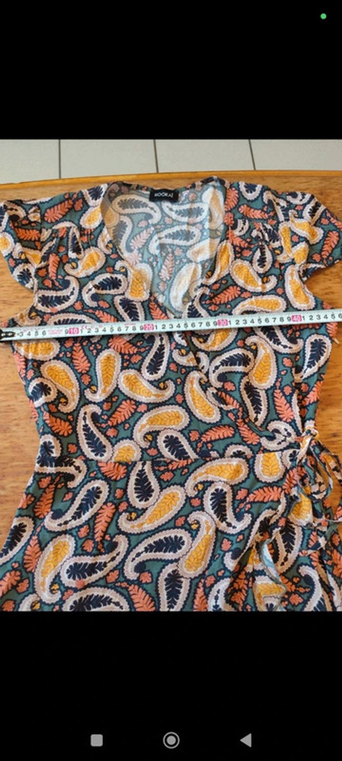 #femme38samcec1802 Robe cache cœur multicolore, manches courtes, col V, coupe ceintrée puis part en évasée. Fluide, tissu non extensible. Mesures (voir photos) - aisselle à aisselle : environ 45cm - taille : environ 35cm - longueur : environ 90cm Taille M Kookaï