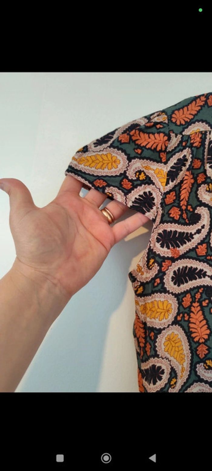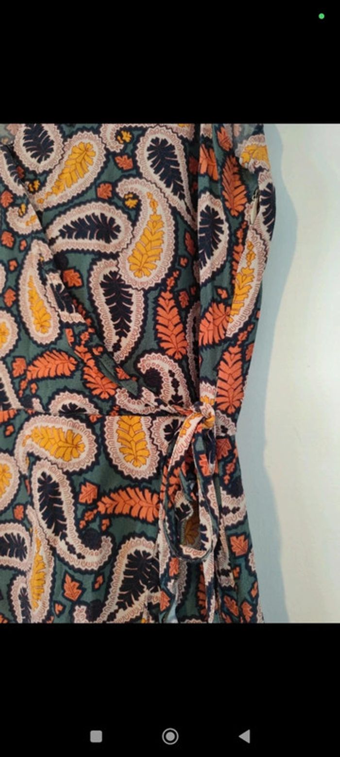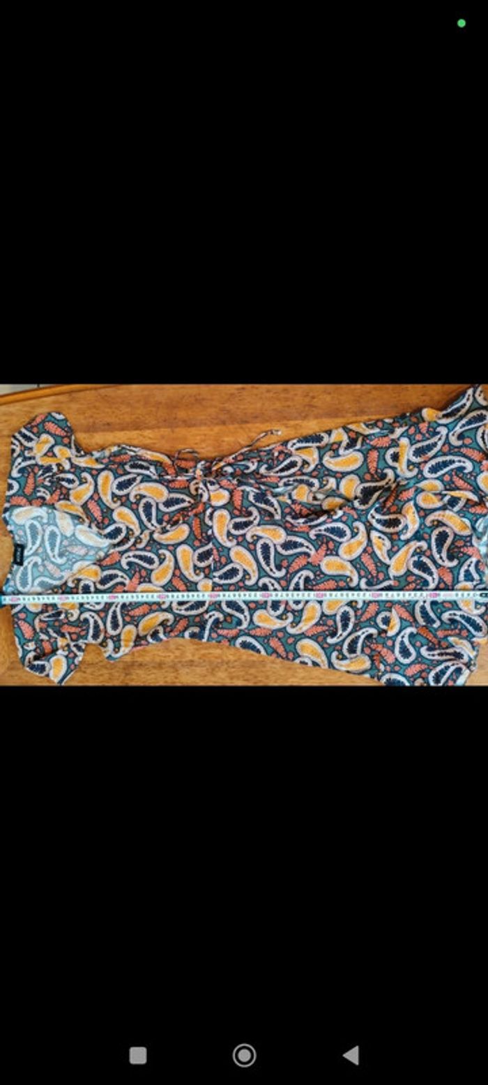 #femme38samcec1802 Robe cache cœur multicolore, manches courtes, col V, coupe ceintrée puis part en évasée. Fluide, tissu non extensible. Mesures (voir photos) - aisselle à aisselle : environ 45cm - taille : environ 35cm - longueur : environ 90cm Taille M Kookaï