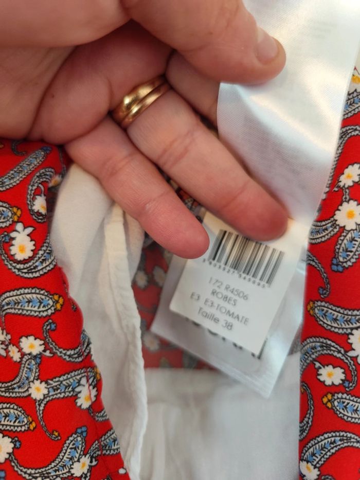 #femme38samcec1802 Robe rouge à fleurs col claudine blanc, fermeture fine sur le côté (ok) Coupe Ceintrée. 2 vraies poches à l'avant Taille 38 Kookaï