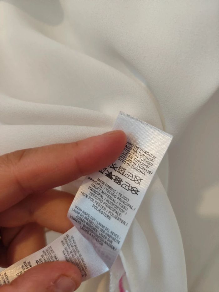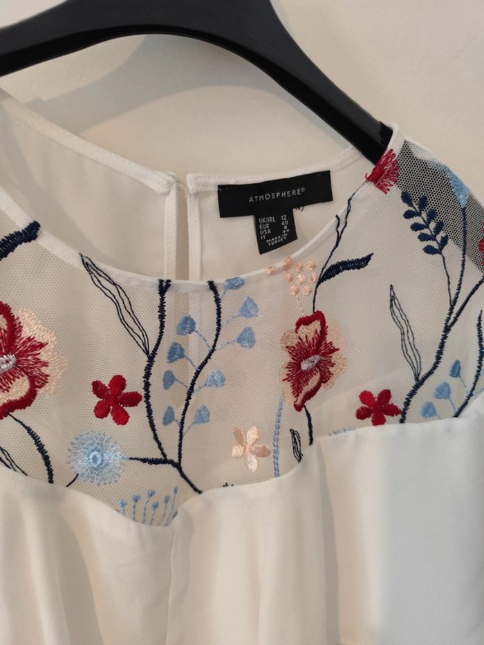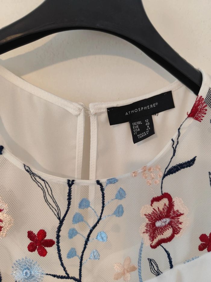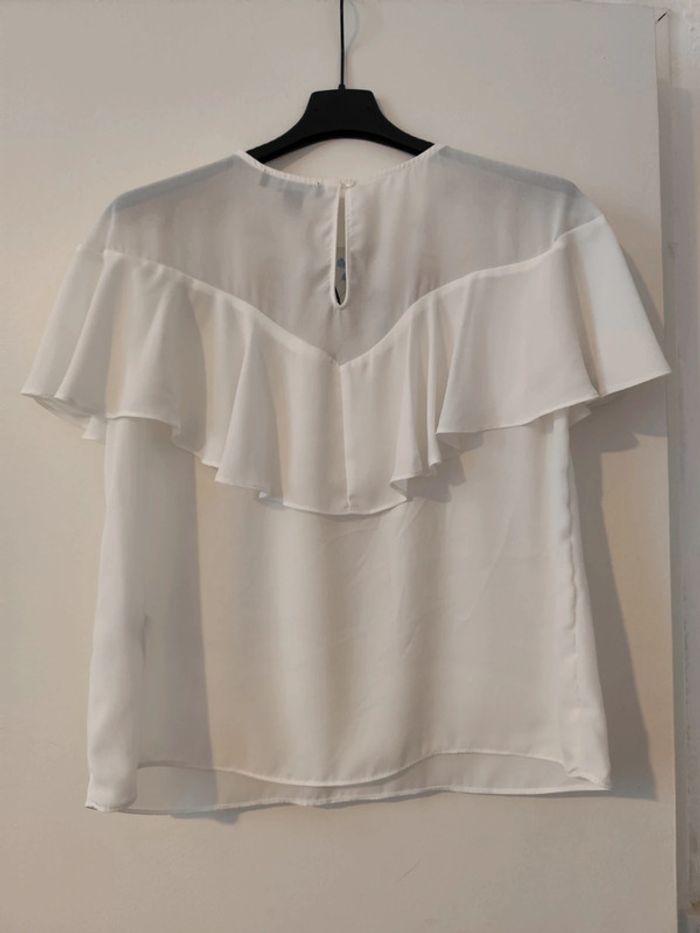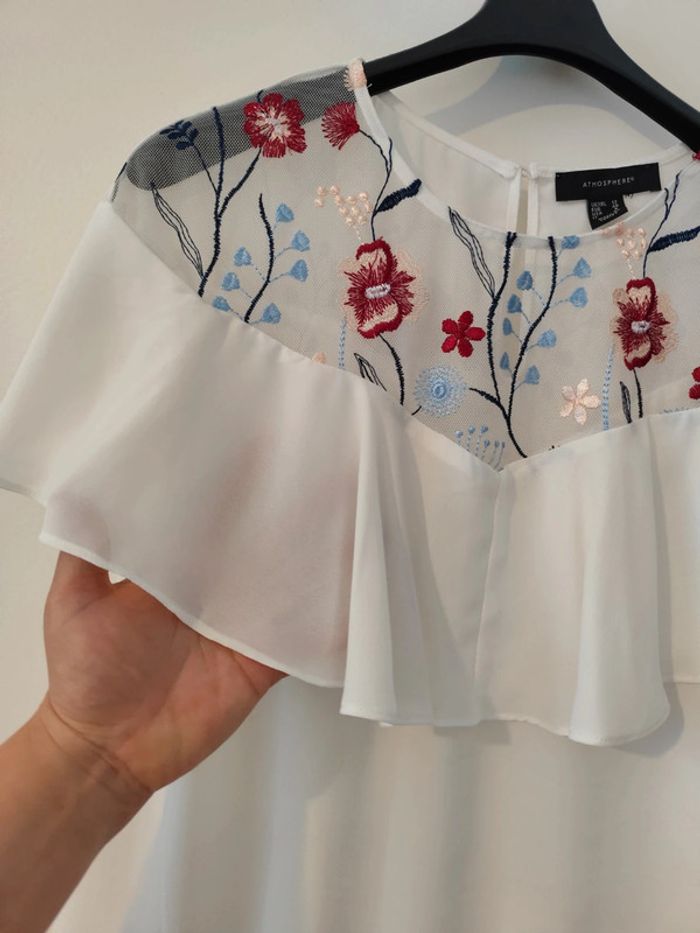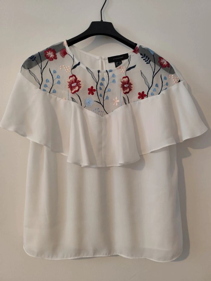 #femme40samcec1802 Jolie blouse blanche fluide, manches courtes en voile. Haut du vêtement transparent fleuri Taille 40 Atmosphère