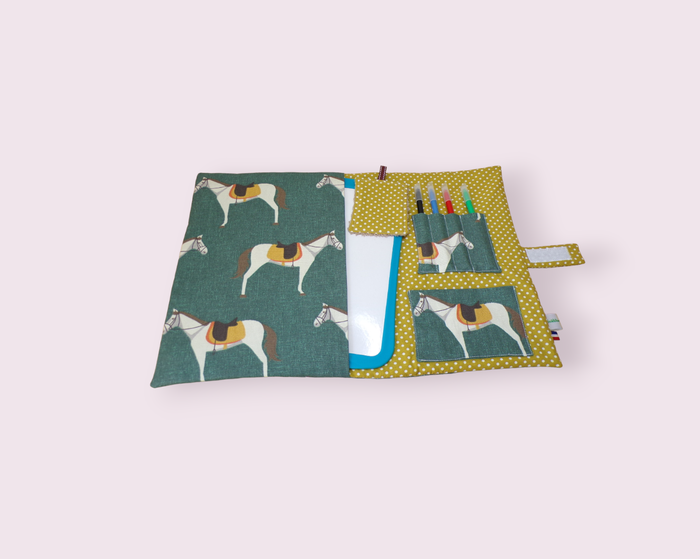 pochette range ardoise et crayons, effaceur offert, modèle cheval fond vert
