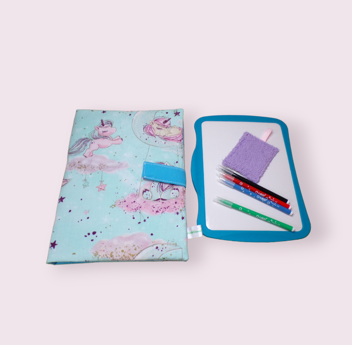 pochette range ardoise et crayons, effaceur offert, modèle licornes fond bleu ciel