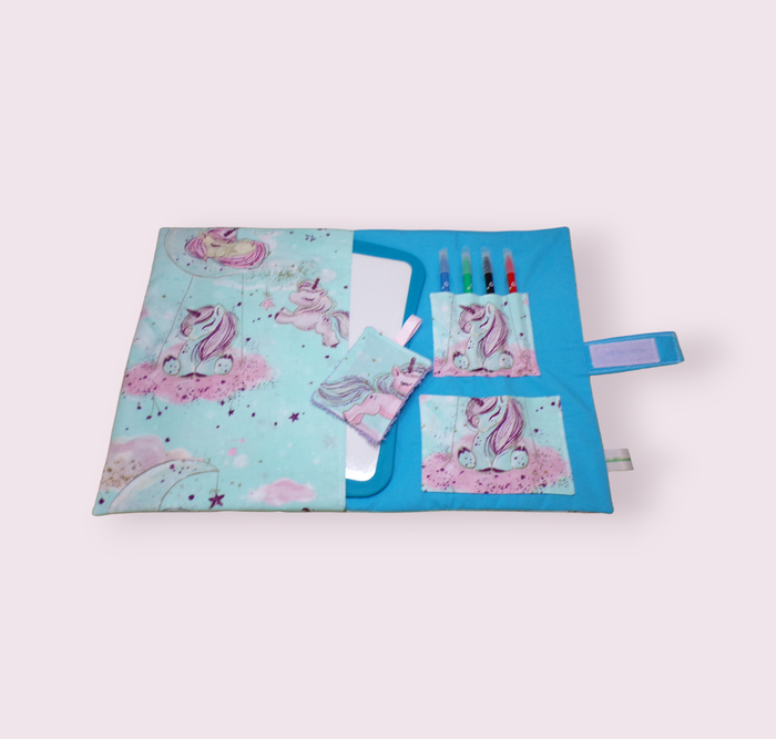 pochette range ardoise et crayons, effaceur offert, modèle licornes fond bleu ciel - photo numéro 1