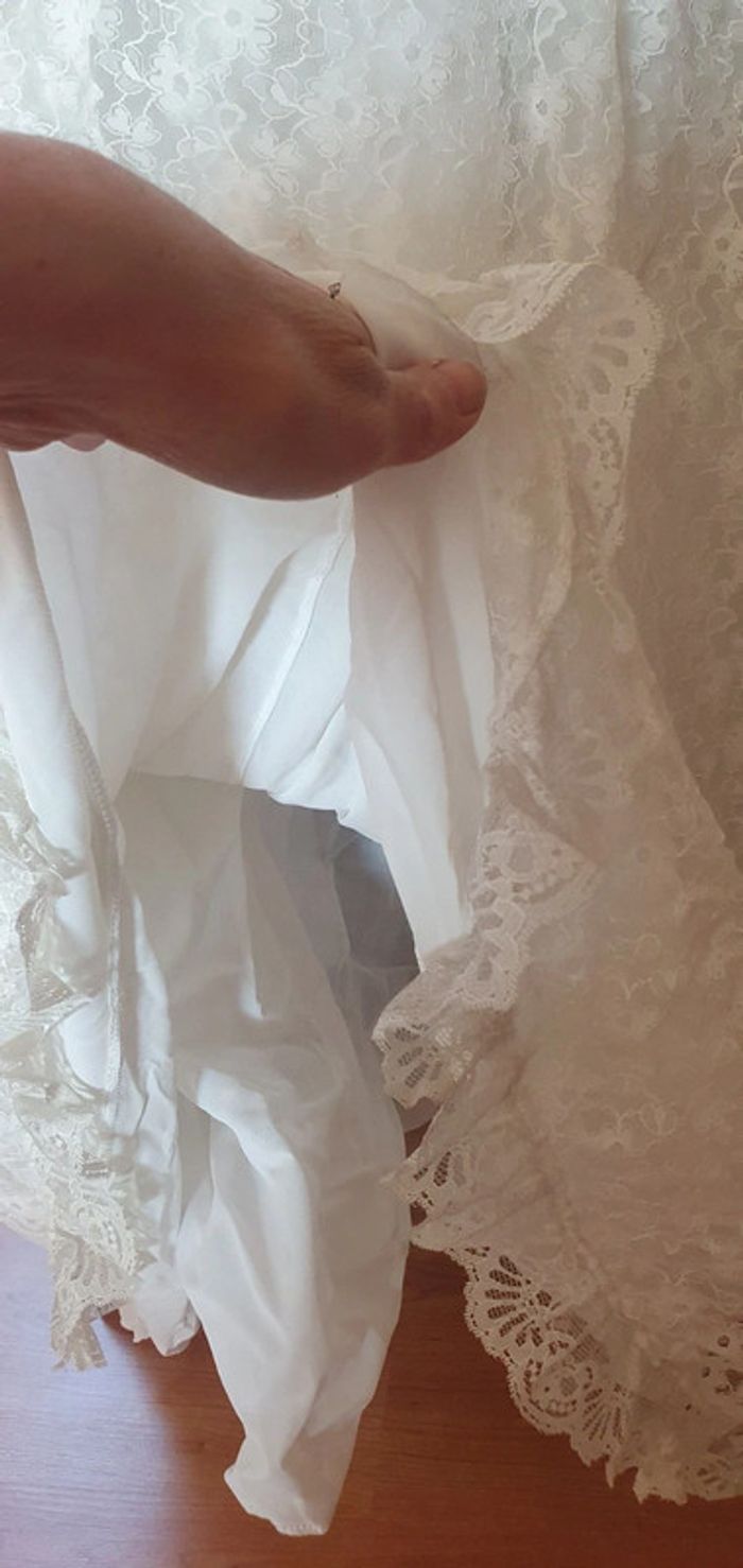 Buste 36/38 Robe de location vintage vendue dans l état Dentelle grisonnante par endroit mais ne se vois pas portée voile disponible et chapeaux diadème.. Idéal divers évènements d autres disponibles mariage défilé déguisement etc A relaver au pressing #valpotinmariage