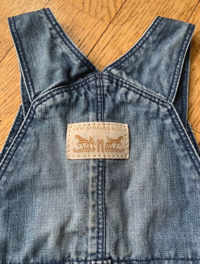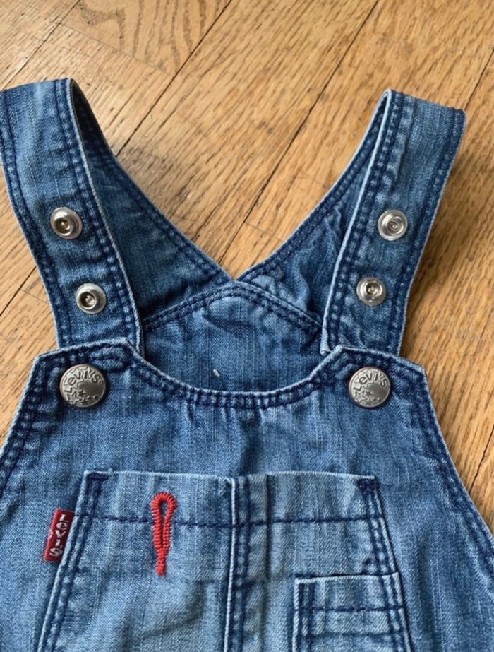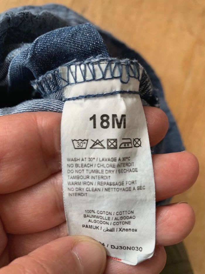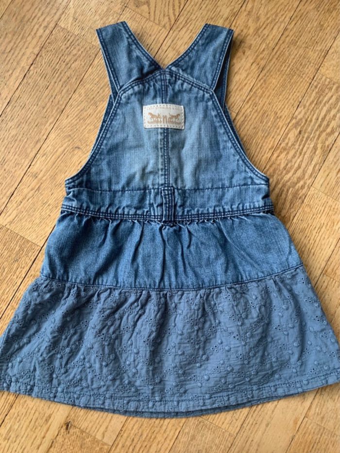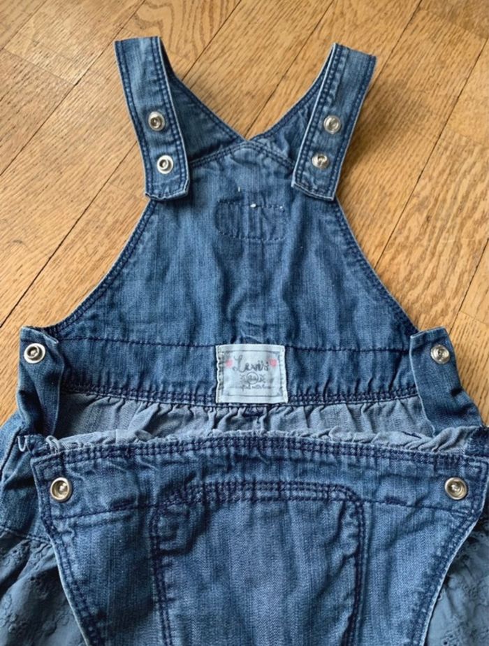 Robe salopette en partie jean et coton léger Fermeture bretelles par boutons pressions Fermeture sur le côté par boutons pressions Taille : 18 mois