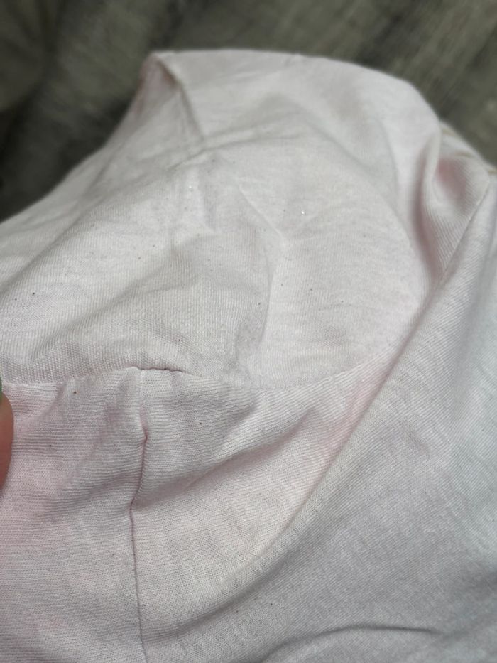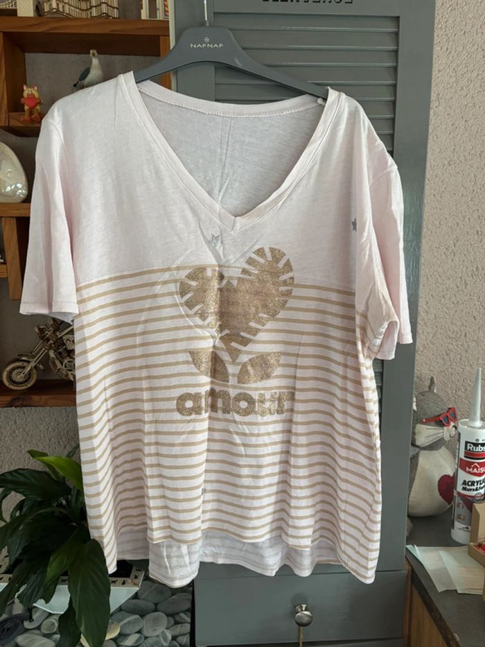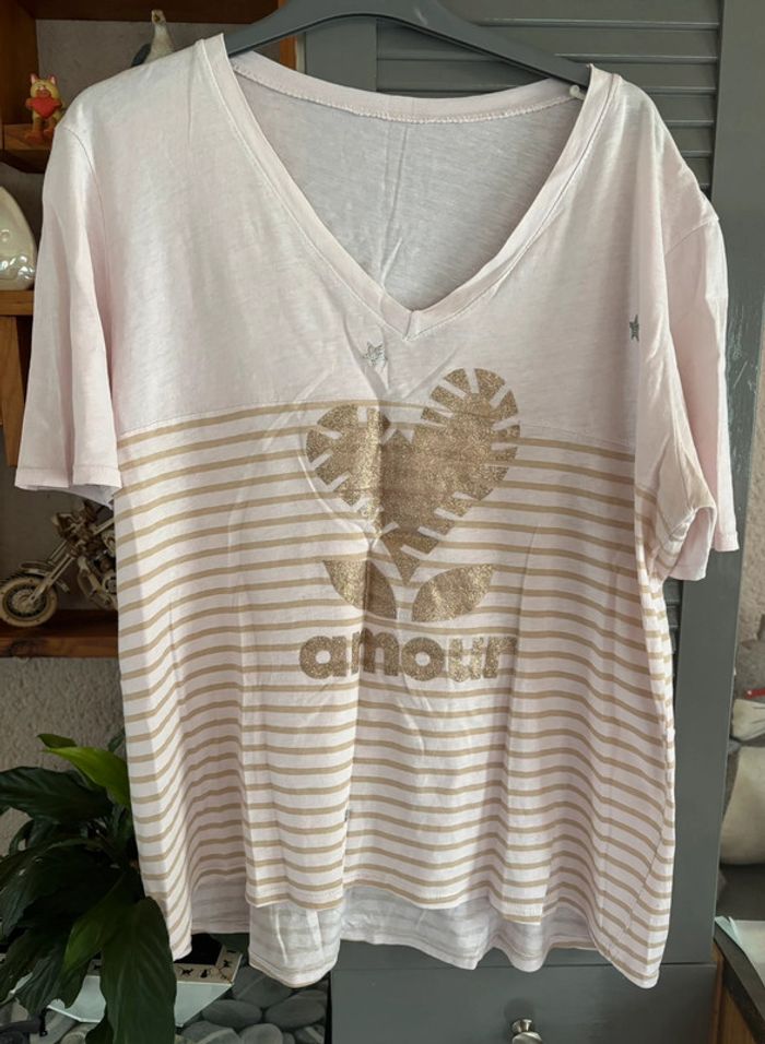 tee shirt rayé Amour beige et le fond légèrement rose car coloration dû à un autre tee shirt mais ne gêne pas taille unique mais correspond à un 42 au 48