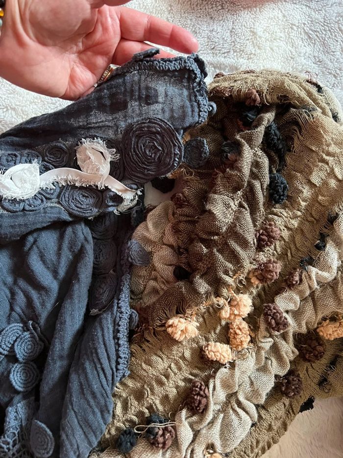 3 écharpes fantaisie et 1 châle 1 écharpe fleurs bleues 1 écharpe marron et beige avec pompons 1 écharpe saumonée et fils or 1 châle bleu