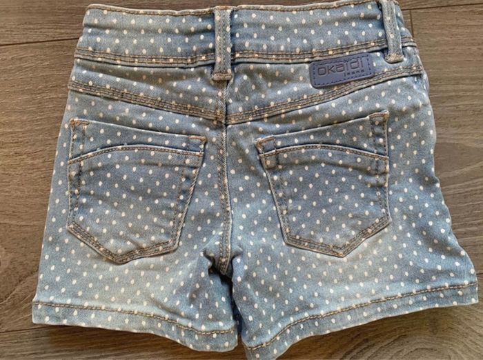 OKAIDI short jean bleu clair petits pois blancs et marguerite sur la poche avec boutons de réglage à la taille Fermeture bouton pression ➡️ 2 ans - 86 cm