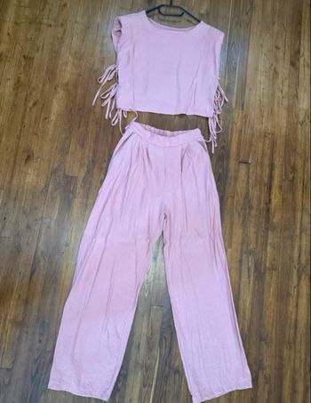 Ensemble costume 3 pièces en mousseline (matiere tres legere et fluide), pantalon débardeur large et veste a perles couleur bleu sarcelle.