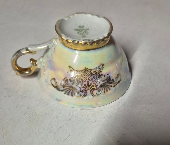 Tasse à thé en porcelaine allemande Couleur blanche et dorures. Dessin sur l'intérieur GkC bavaria n°26 Hauteur 4.5cm Diamètre 7cm Ideal en décoration ou pour compléter un service. Tres bon état - aucun éclats visible #tasse #tassethe #tasseporcelaine #tasseporcelainevintage #tasseporcelaineallemande #bavaria #gkcbavaria