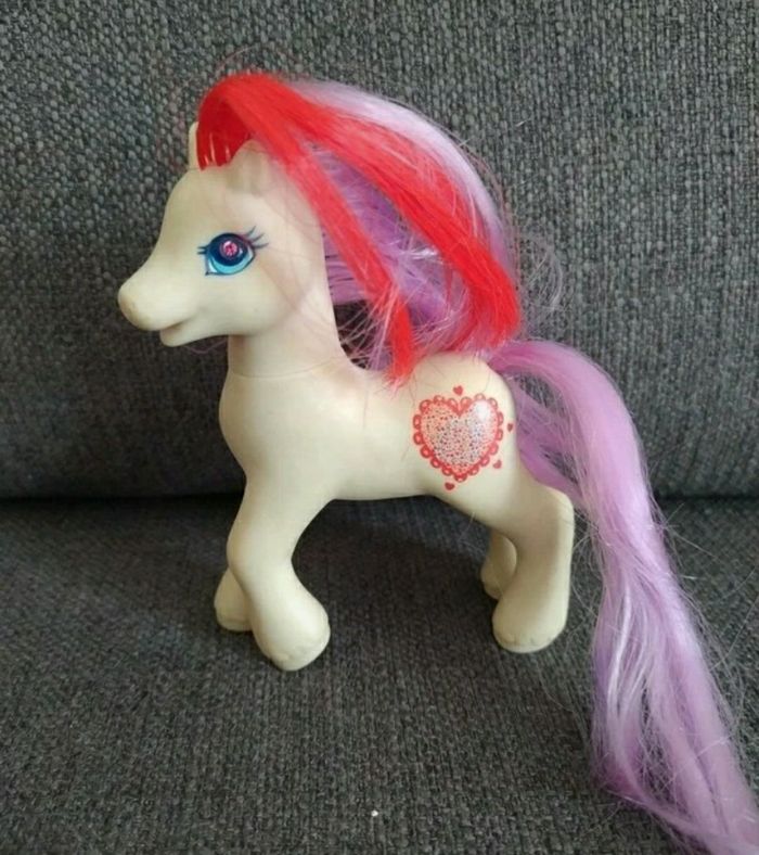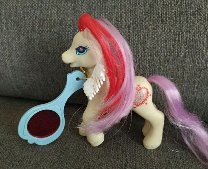 Poney blanc avec crinière violet rouge de 1997 Avec miroir pour voir les formes caché sur le poney et brosse