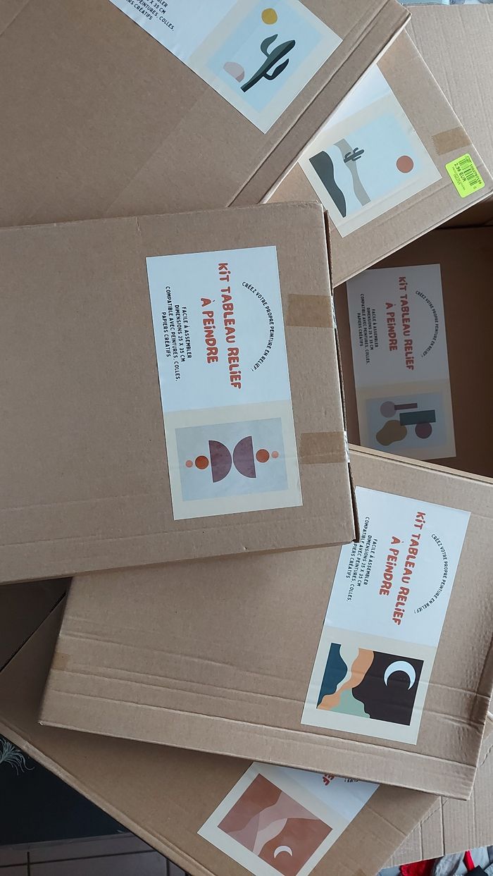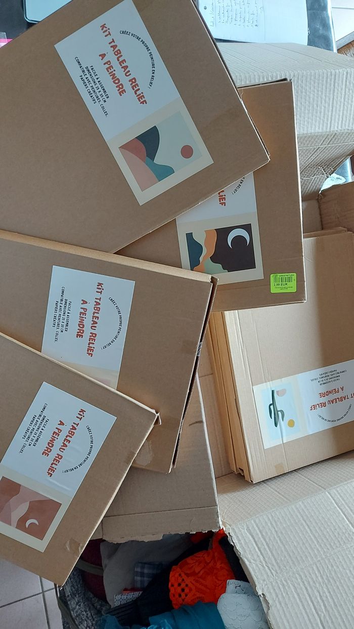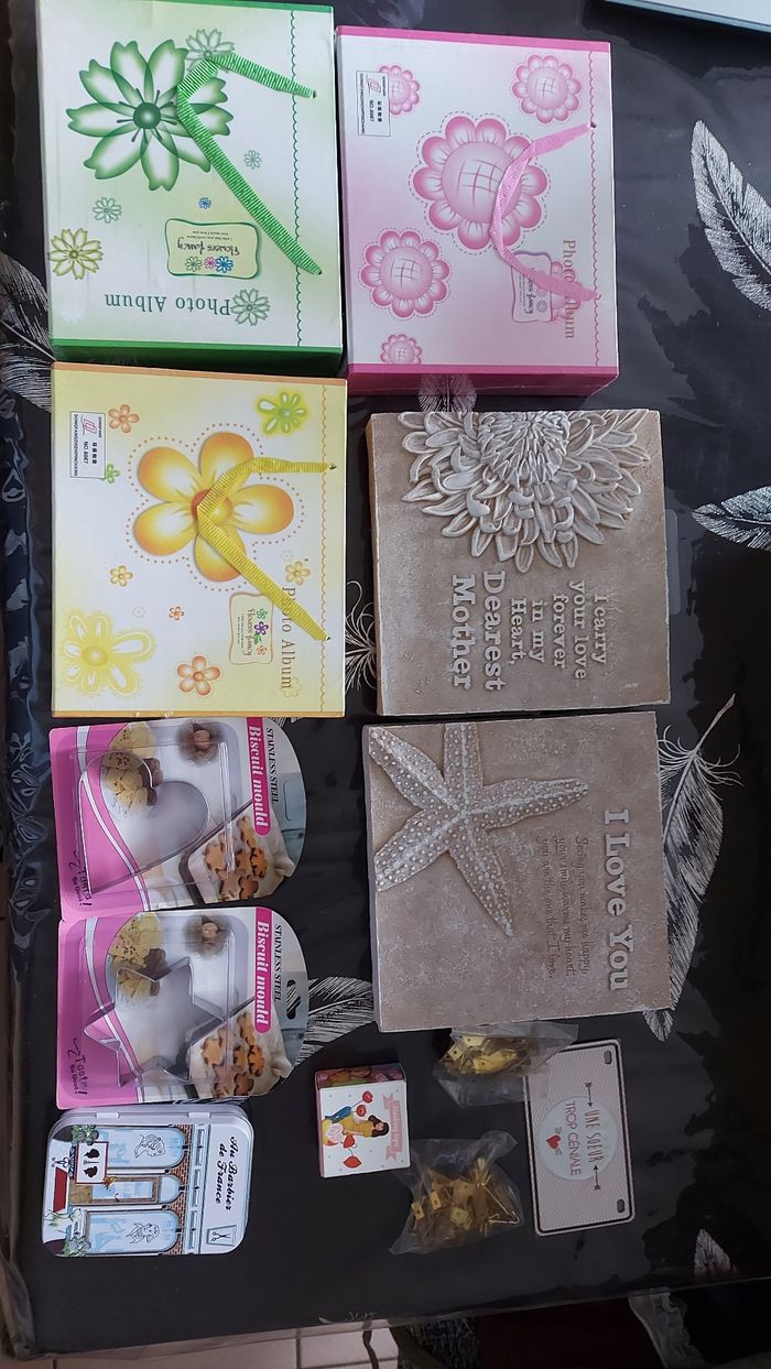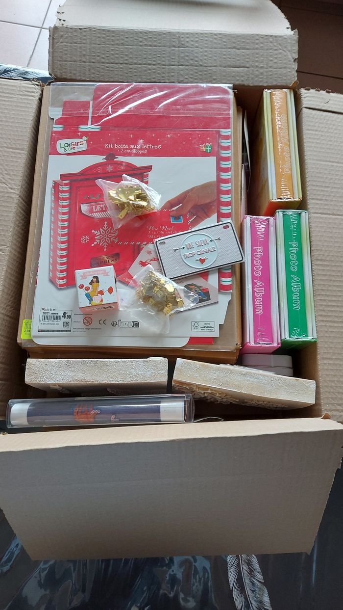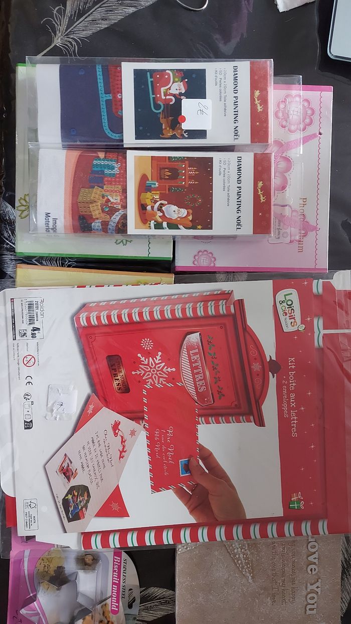 Lot comprenant : 3 albums photos 2 sachets d'attaches pour cadres/suspensions 1 plaquette métallique décorative 1 tape de recouvrement 2 plaques synthétiques style t'être cuite avec texte 2 emporte pièces 1 boite aux lettres à monter, en carton, Père Noël 8 tableaux à peindre, modèles différents 1 petite boîte en fer 2 diamond painting de Noël Lot non modifiable, offres non acceptées car prix mini