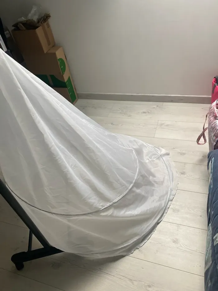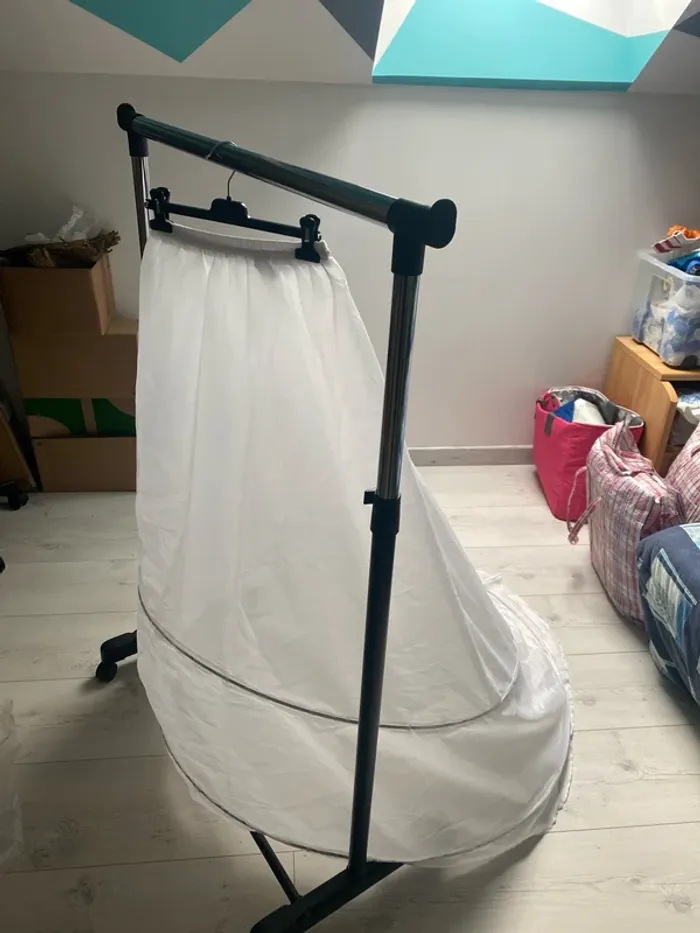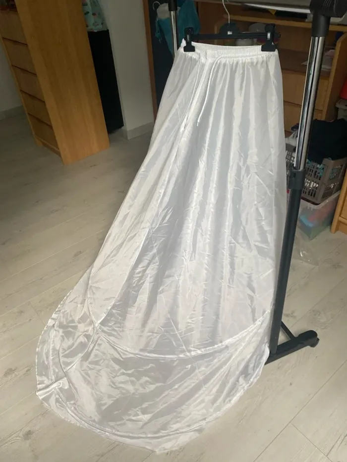 Jupon pour robe de mariée, deux cerceaux en bas, légère, forme de traîne à l’arrière Élastique au plus large 46 cm, détendue environ 30 cm Se positionne au niveau des côtes flottantes Diamètre du cerceau du bas au plus large, 120 cm Du 36 au 42 minimum Pas porté car ne convient pas a ma robe qui est plus ample en bas Neuf 39€ #femmexav