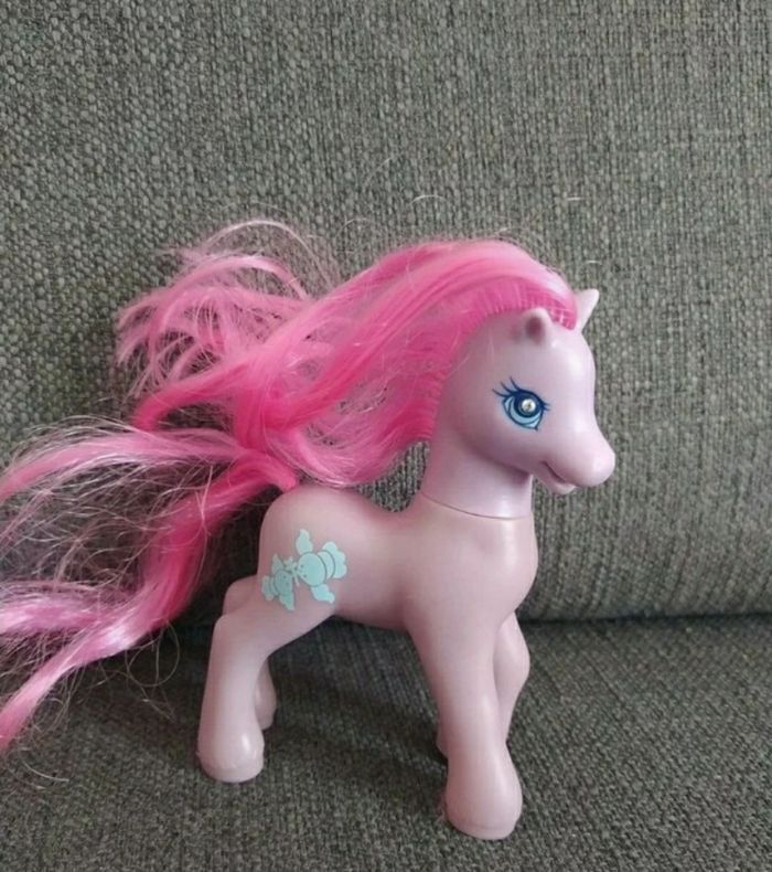 Poney violet avec crinière rose et diamants blanc dans l'oeil. Poney de 1998 avec brosse