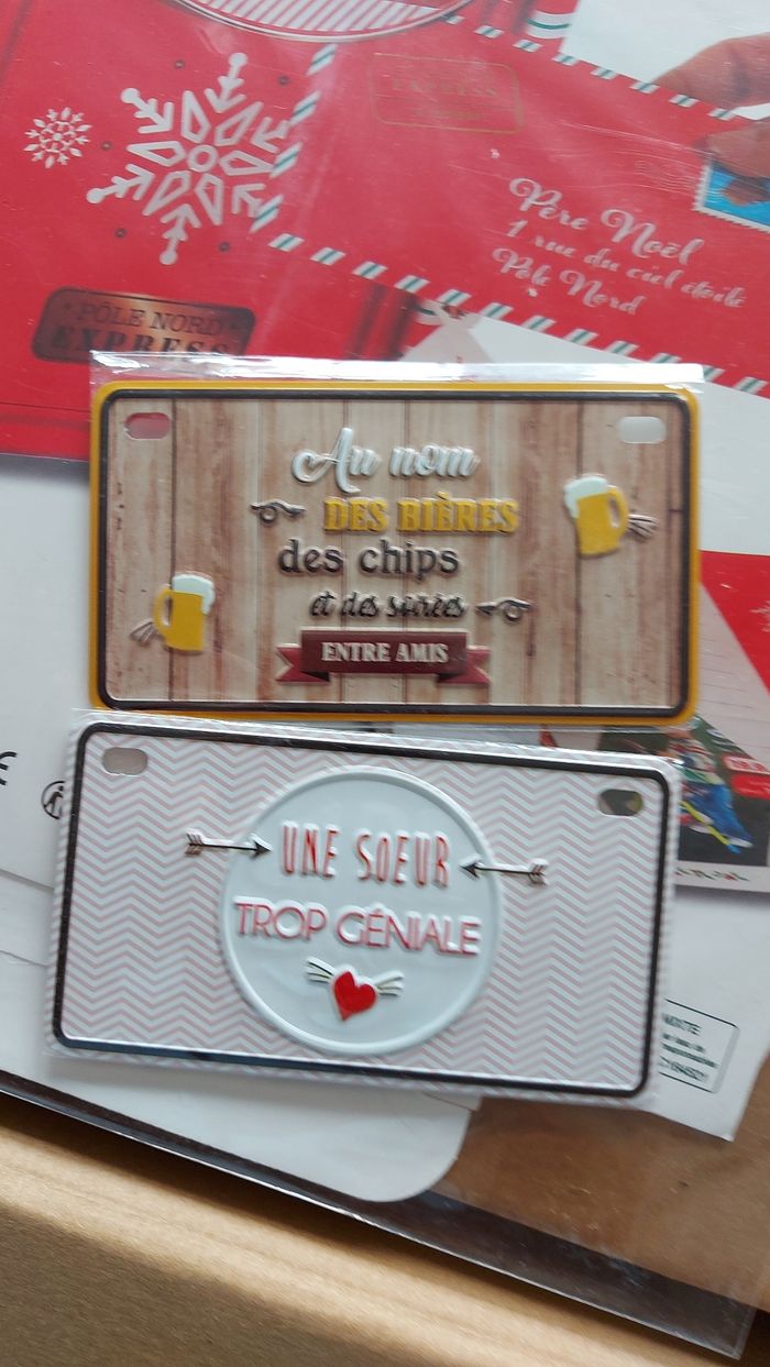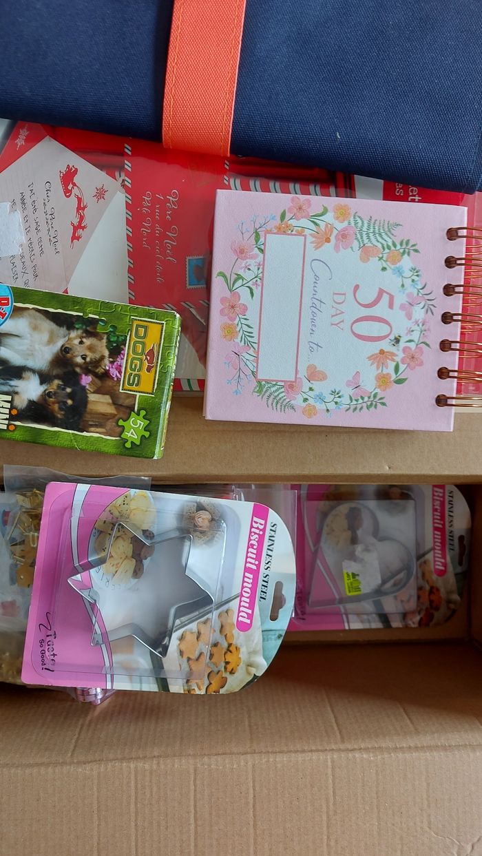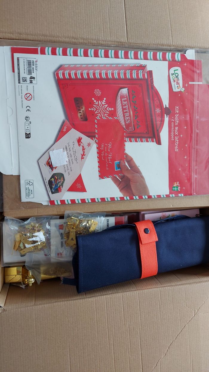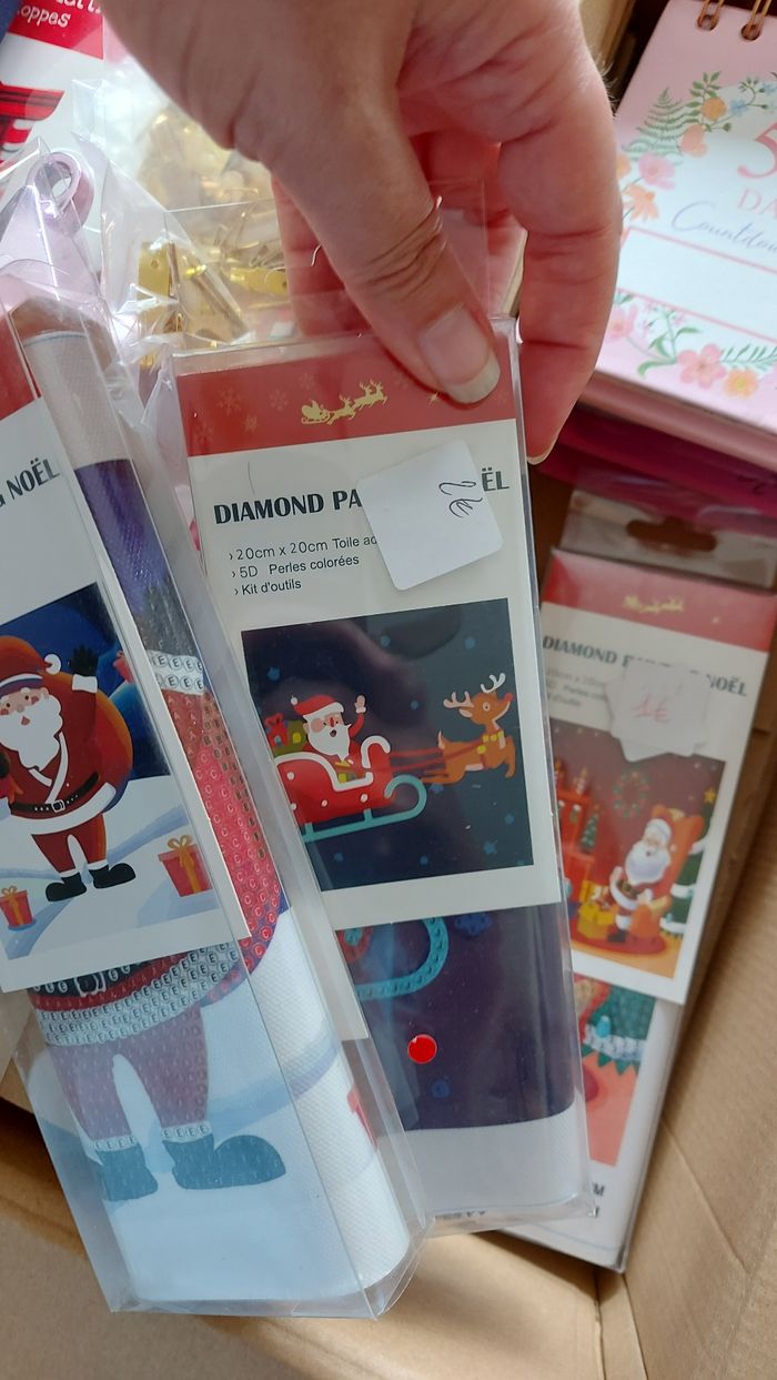 Lot comprenant : 6 tableaux à peindre 3 sachets d'attaches pour cadres/suspensions 2 plaquettes en métal 1 boite aux lettres Père Noël, en carton, à monter 3 diamond painting de Noël 1 backgammon de voyage 1 calendrier à décompter 50 jours 2 emportes pièces 1 mini puzzle 2 étoiles à suspendre, lourdes, une est légèrement abîmée par l'entreposage Lot non modifiable, pas d'offre acceptée car le prix est mini