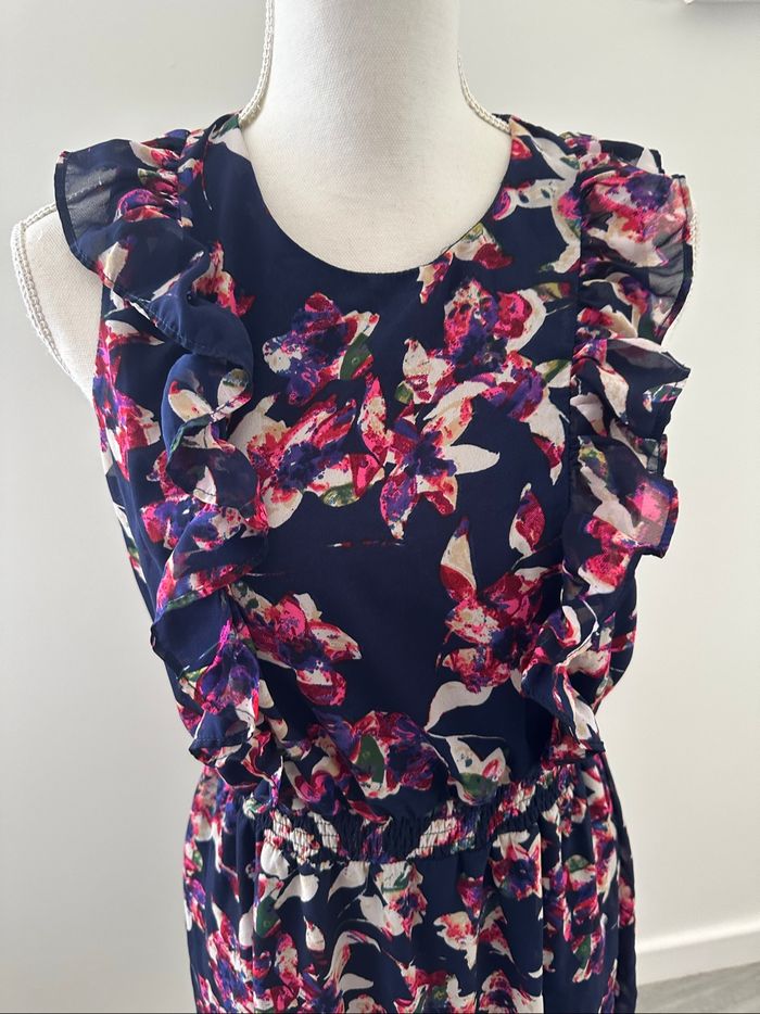 Robe à fleurs - Excellent état - Taille 36 équivalent S Dimensions en bas de l’annonce - Bleu marine et multicolore - Imprimés fleurs - Froufrous sur le haut - Élastique à la taille - Pas d’étiquette de taille ni de matière Dimensions: - 50cm niveau aisselles - 84cm de long