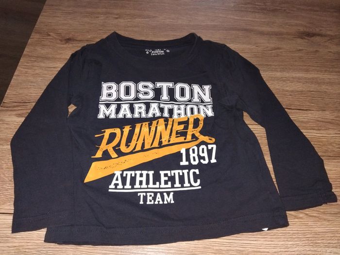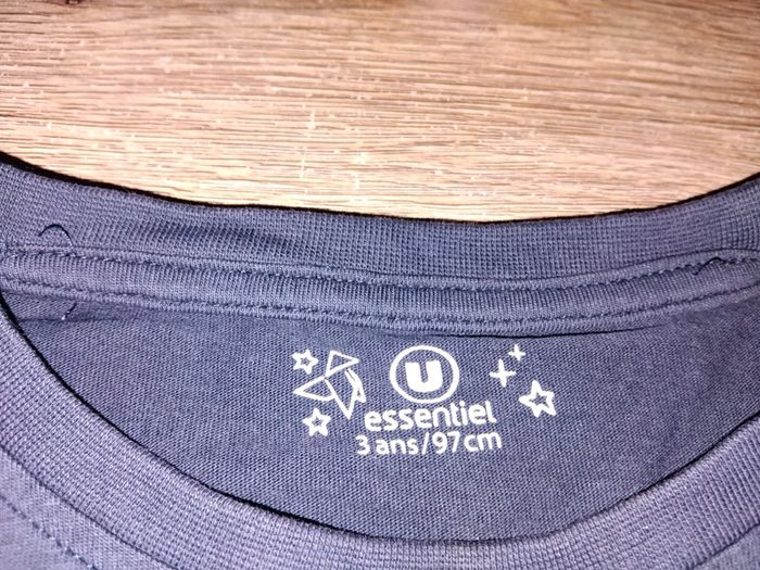 Bonjour, je vends ce tee shirt a manches longues marine avec écritures de la marque U essentiel taille 3ans en très bon état.