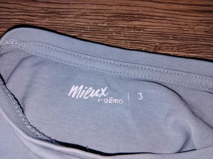 Bonjour, je vends ce tee shirt a manches longues bleu ciel avec motifs de la marque mieux by Gémo taille 3ans en très bon état.